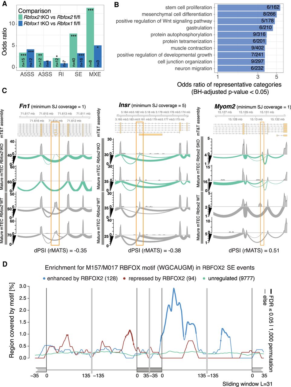 RBFOX regulates alternative splicing in TEC. (A) The bar plots show the enrichments (ORs) of previously predicted Rbfox target genes (Weyn-Vanhentenryck et al. 2014) in the sets of genes differentially spliced in the Rbfox1 tKO or Rbfox2 tKO mature mTEC (two-sided Fisher's exact tests, BH adjusted P-values): (*) P < 0.05, (**) P < 0.01, (***) P < 0.001; abbreviations as for Figure 4B. (B) Selected GO biological processes significantly overrepresented (one-sided Fisher's exact tests, BH adjusted P-values < 0.05) in genes that contained significantly RBFOX2-regulated SE events in mature mTEC. (C) Three examples of significantly (FDR < 0.05) RBFOX2-regulated splicing events in mature mTEC. Fn1 and Insr are known RBFOX target genes (Chen and Manley 2009; Weyn-Vanhentenryck et al. 2014). Myom2 is an example of a non-Aire TRA gene. (D) Enrichment of the RBFOX recognition motif (M159/M017) (Ray et al. 2013) in the sequences surrounding exons that were found to be significantly regulated by RBFOX2 in mature mTEC (Supplemental Fig. 18B). The lines show enrichments for sets of exons found to be enhanced (blue), repressed (red), or not significantly regulated (green) by RBFOX2. Thicker lines indicate regions of statistically significant enrichment (FDR ≤ 0.05, n = 1000 permutations).
