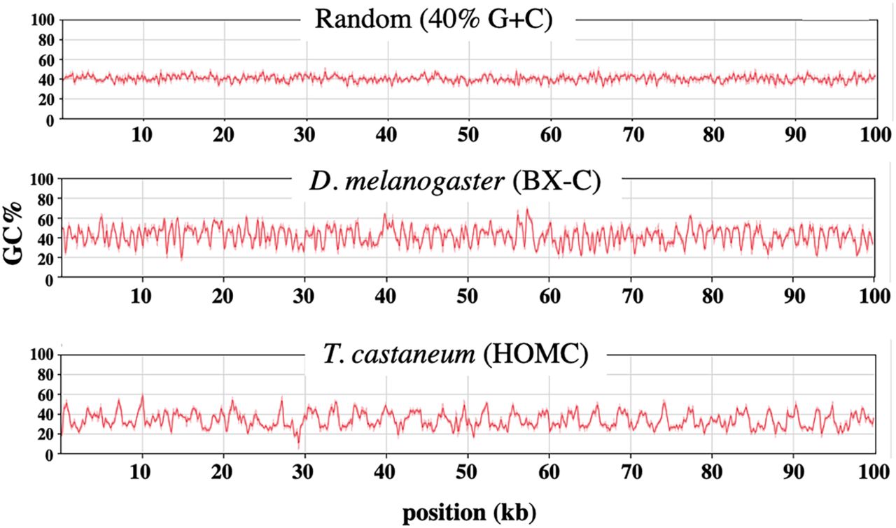 Oscillations in base composition. GC% is plotted for a 200-base sliding window across 100-kb DNA segments, as implemented with the MacVector DNA analysis software. The DNA segments are centered on the abd-A genes (D. melanogaster 3R 16.77–16.87 Mb; T. castaneum LG2 8.021–8.121 Mb).