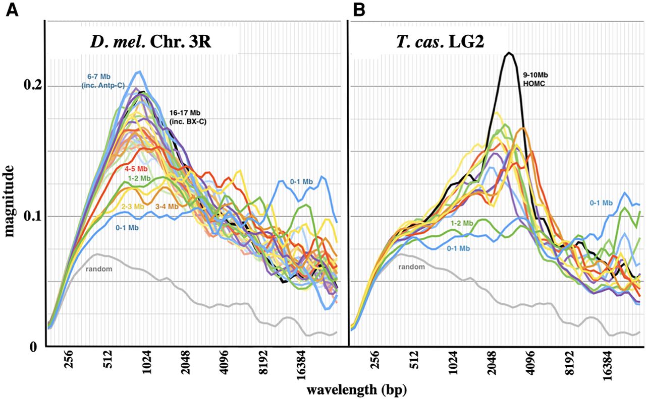 Chromosome-wide distribution of oscillations. (A) Average magnitude as a function of wavelength for 32 successive 1-Mb segments along Chromosome 3R of D. melanogaster. The first five 1-Mb segments encompass centric heterochromatin, with a high density of repetitive sequences; this region shows weak oscillation. The remaining 27 1-Mb segments all show peak wavelengths of ∼1 kb. The strongest signal comes from the 6–7 Mb segment, which includes the ∼390 kb Antennapedia complex. The 16–17 Mb segment, which includes the ∼315 kb bithorax complex, is also prominent. (B) Average magnitude for 15 successive 1-Mb segments of T. castaneum LG2. Again, the 0–1 and 1–2 Mb segments are highly repetitive and show weak oscillation, and the other 13 segments show stronger signals at wavelengths of ∼2.5 kb. The 8–9 Mb segment, which includes the HOMC, shows the strongest signal.