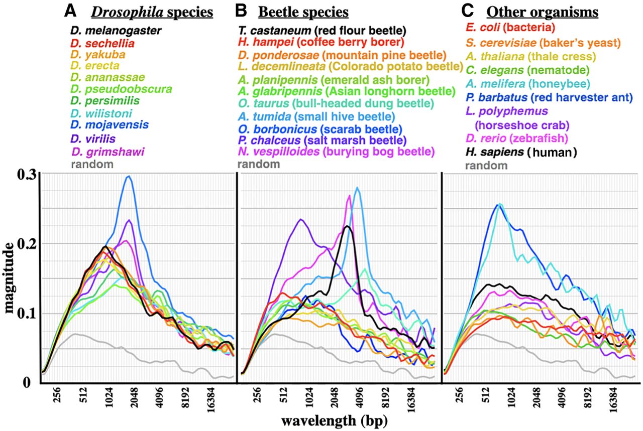 Magnitude graphs for various species. (A) Eleven Drosophila species (in order of evolutionary distance from D. melanogaster, red to purple). (B) Eleven beetle species. (C) Nine diverse organisms, from bacteria to mammals. Sequences analyzed were centered on homologs of D. melanogaster Ultrabithorax (where available) and covered 1 Mb (where contiguous sequences extended that far). Clear GC% oscillations are apparent in many insects, but not in the non-insect species shown here.
