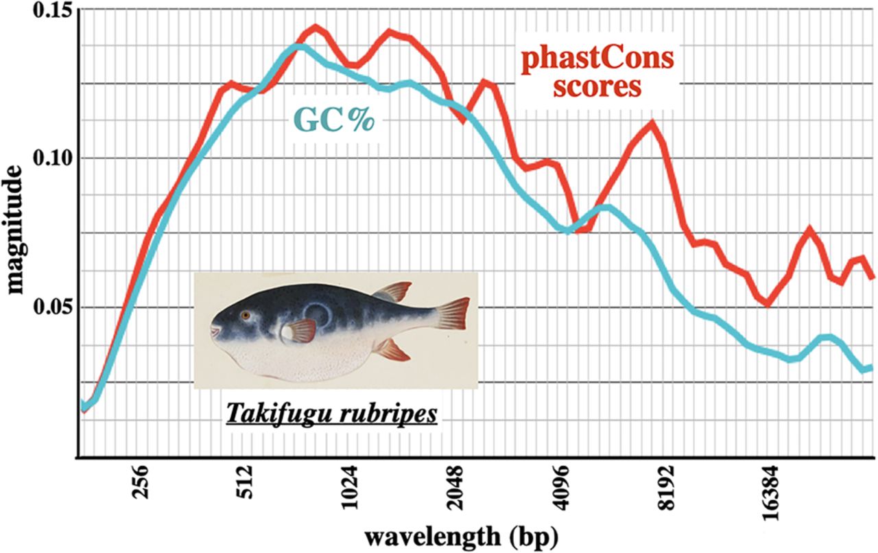 Pufferfish oscillation in GC% and in conservation. Six exon-poor segments of the Takifugu rubripes Chromosome 1, combined with the HOX Aa, Ba, and C loci (∼1.27 Mb in total) were analyzed as in Figure 6. The fish shows broad peaks of oscillation magnitude in GC% and conservation. The pufferfish picture (courtesy of Naturalis Biodiversity Center/Wikimedia Commons) is an early 1800s work by Kawahara Keiga.
