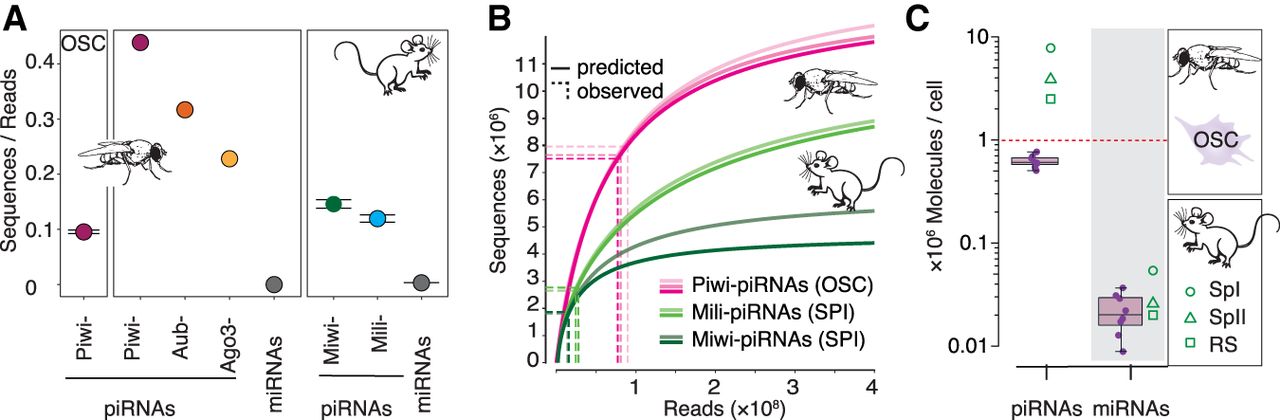 The sequence diversity of piRNAs exceeds the capacity of an individual cell and generates cell-to-cell variability. (A) Sequence diversity (sequences/reads) of piRNAs associated with different PIWI proteins in flies and mice. Piwi-piRNAs in ovarian somatic sheath cells (OSCs) (mean ± SD, n = 3; this study). Piwi-, Aubergine- (Aub), and Argonaute 3- (AGO3) piRNAs in Drosophila ovaries (GEO: GSE83698) (n = 1). Miwi/Piwil1- and Mili/Piwil2-piRNAs in primary spermatocytes (BioProject: PRJNA421205) (n = 2, range indicated) (Supplemental Table S1). For comparison: microRNAs (miRNAs) according to miRBase annotation from total small RNA data sets (GEO: GSE83698 and SRA: SRR3715418). (B) Prediction of piRNA populations according to species accumulation curves based on experimental sampling. Piwi-piRNAs from OSCs (this study) (n = 3) and Mili- and Miwi- piRNAs from primary spermatocytes (SPI) (n = 2) (BioProject: PRJNA421205). The number of sampled reads (x-axis) and sequences (y-axis) is indicated by dotted lines. (C) The average number of Piwi-piRNAs and miRNAs in a single cell. Numbers based on calibrated sequencing of total small RNAs from OSCs (median, 25th–75th percentile, data points for the eight biological replicates are indicated [n = 8]) (Supplemental Fig. S1C). Mouse data from primary spermatocytes (SPI), secondary spermatocytes (SPII), and round spermatids (RS) from Gainetdinov et al. (2018) are shown for comparison.
