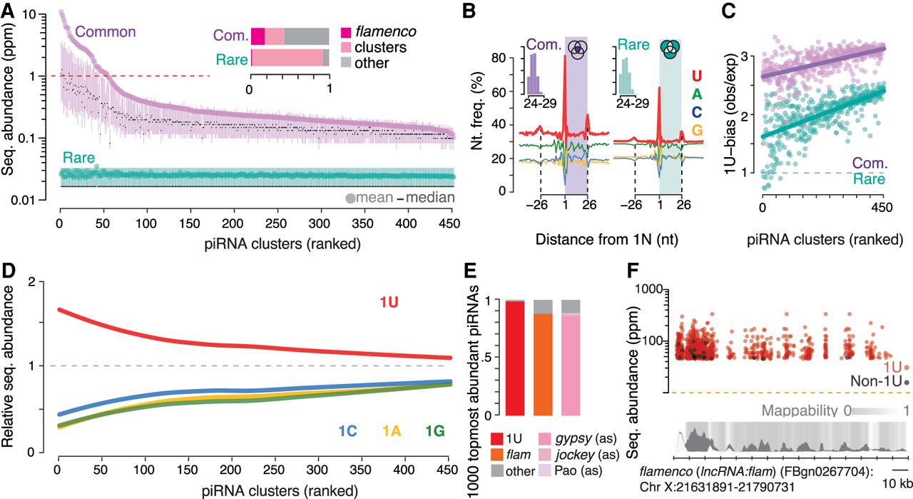 Precursor and processing preferences determine piRNA sequence abundance. (A) A small number of top-ranked piRNA clusters (Supplemental Table S3), led by flamenco (lncRNA:flam), produces common sequences (purple) with an average abundance of more than one read per million (red dotted line). Clusters were ranked by the mean abundance of common sequences (Supplemental Table S3). The sequence abundance of common and rare Piwi-piRNAs for each cluster is shown (mean, median, 25th–75th percentile; n = 3). Inset: The fraction of common and rare Piwi-piRNAs that originate from flamenco (lncRNA:flam) and other piRNA clusters. (B) Common and rare Piwi-piRNAs are generated by the Zuc-processor. Metagene analyses reveal the phased preference of the Zuc-processor for uridine (U) in the first position of the observed piRNAs (colored box) as well as in the first position of proceeding and preceding piRNAs. Inset: Length distribution of common and rare piRNAs in nucleotides (nt). (C) Common piRNAs have a stronger 1U-bias than rare piRNAs from the same cluster. The bias for uridine (1U-bias) in the first position—observed over expected 1U frequencies (obs/exp)—of Piwi-piRNAs (clusters ranked as in A and D). (D) Uridine in the first position (1U) is indicative of higher sequence abundance. The mean abundance of piRNAs that start with a uridine (1U) was compared to that of piRNAs that start with either adenosine (1A), guanosine (1G) or cytidine (1C). The mean abundance of 1U-, 1A-, 1G-, and 1C-sequences relative to the mean abundance of all sequences from the same cluster (relative sequence abundance) is shown (clusters ranked as in A and C). (E,F), Most of the 1000 topmost abundant Piwi-piRNAs exhibit a 1U, originate from flamenco (lncRNA:flam) (flam) and show antisense-complementarity (as) to gypsy endogenous retroviruses. Annotated fractions (E) and genomic position within flamenco (lncRNA:flam) (F). Multimapping sequences are represented with all possible coordinates within flamenco (lncRNA:flam) (F).