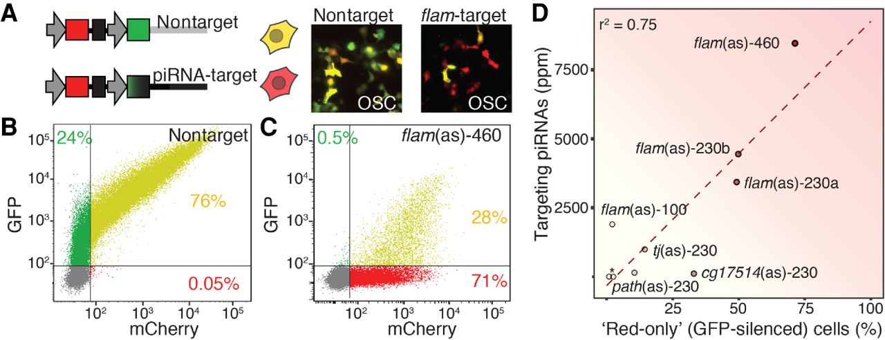 Silencing directly correlates with piRNA abundance. (A) A reporter assay for Piwi-piRNA silencing. GFP (green) reports silencing by endogenous piRNAs. mCherry (red) serves as a control. GFP and mCherry are expressed from the same plasmid by individual promoters and separated by an insulator sequence. Different target sites with antisense complementarity to piRNA-generating regions were inserted into the 3′ UTR of GFP (piRNA target) (Supplemental Table S4). Sensors were expressed in ovarian somatic sheath cells. Expression of the dual color reporter was visualized (A) and measured by flow cytometry (B,C) 48 h after transfection. (B) Without any target site (nontarget), the sensor expressed both fluorophores in 76% of the transfected cells. (C) A flamenco (lncRNA:flam)-target sensor (flam[as]-460) showed complete silencing of GFP in 71% of the transfected cells (“red only” cells). (D) piRNA abundance correlates with silencing. Correlation of “red-only” (GFP-silenced) cells and the total abundance of complementary piRNAs (in parts per million). Pearson correlation coefficient (r2). piRNA-sensors with different target sequences complementary to flamenco (lncRNA:flam) (varying target length: 100, 230, 460 nt) or complementarity to other piRNA-producing regions: traffic jam (tj), pathetic (path), l(3)80Fj (CG17514), and two different intervals of Cyclin B (*) (constant length 230 nt) (Supplemental Table S4). The dispersion of data points might be partly caused by quantifying fully complementary piRNAs as a surrogate for targeting piRNAs (y-axis), and by only considering completely silenced (“red-only”) cells (x-axis). Future improvements in our understanding of piRNA:target engagement will enable refinement of these scores.