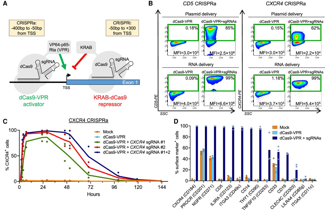 CRISPRa by plasmid and RNA-based delivery. (A) CRISPRa or CRISPRi is mediated by a nuclease-deactivated Cas9 (dCas9) fused to effector domains that either activate (VP64-p65-Rta [VPR]) or inhibit (KRAB) transcription. The fusion protein is guided by one or more sgRNAs targeted to the region surrounding the transcriptional start site (TSS). The guidelines for sgRNA positioning relative to the TSS have been empirically devised by Gilbert et al. (2014) and are shown in the yellow boxes. (B) Representative FACS plots (N = 3) showing the analyses of target gene expression in K562 cells 24 h after electroporation with CRISPRa systems based on either plasmid or RNA delivery. For the plasmid-based platform, one plasmid encodes dCas9-VPR, and separate plasmids each express a sgRNA targeting the TSS region of the target gene (CD5 or CXCR4). The RNA-based platform is based on in vitro transcribed mRNA encoding dCas9-VPR and synthetic, chemically modified sgRNAs. Four sgRNAs were used for CD5, and two sgRNAs were used for CXCR4. Gates contain cells that are positive for the target protein with percentages shown in the upper right corner. Each FACS plot also displays the mean fluorescence intensity (MFI) of all live cells. (C) Time course experiment showing the percentage of CXCR4+ cells measured by flow cytometry following electroporation with dCas9-VPR mRNA and two chemically modified sgRNAs. (D) CRISPRa of 14 different target genes in K562 cells. Cells were analyzed by flow cytometry 24 h after electroporation with dCas9-VPR mRNA and chemically modified sgRNAs (two to four sgRNAs per gene). The percentage of cells positive for the surface marker is shown. For all graphs, N is number of data points, and all bars show mean values with individual data points plotted.