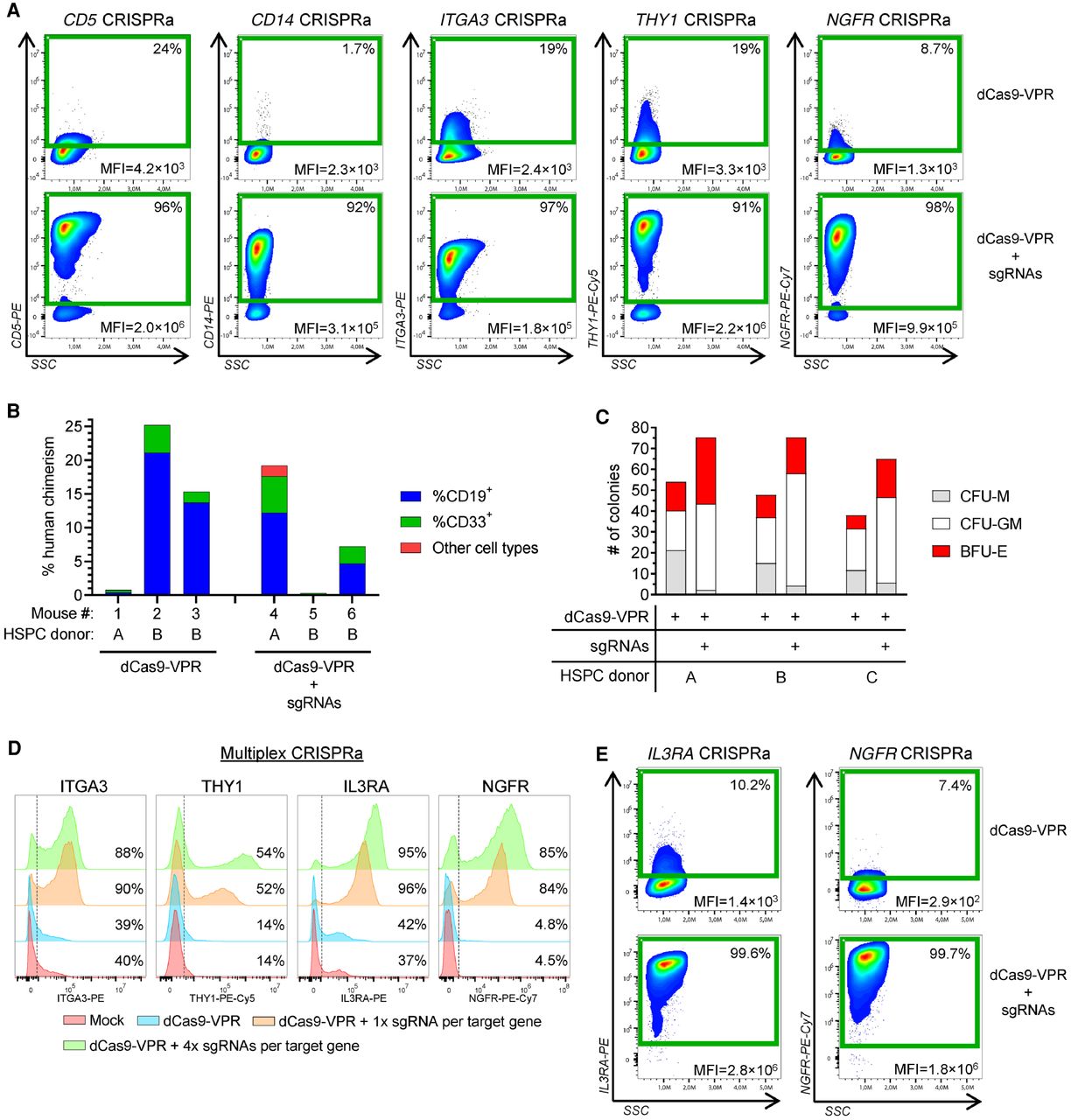 CRISPRa in human CD34+ HSPCs. (A) CRISPRa in human CD34+ HSPCs electroporated with dCas9-VPR mRNA and chemically modified sgRNAs (three to four sgRNAs per gene). Representative FACS plots are shown with the gates containing surface marker–positive cells 24 h post electroporation and the frequencies of cells within the gates are shown. Each FACS plot also displays the MFI of all live cells. (B) To confirm maintained repopulation potential of human CD34+ HSPCs following CRISPRa, CD34+ HSPCs from two cord blood donors (A and B) were electroporated with dCas9-VPR mRNA with or without three chemically modified sgRNAs targeting PROCR and then transplanted into irradiated immunodeficient NOG mice. Twenty weeks after transplant, bone marrow of the transplanted mice was analyzed by flow cytometry for human chimerism and multilineage reconstitution (CD33+ myeloid cells and CD19+ B cells). Graphs show the percentage of human chimerism for individual mice with the fraction of myeloid cells, lymphoid cells, and other cell types shown within each bar. Each bar represents one mouse. (C) Colony-forming unit (CFU) assay of CD34+ HSPCs from three donors with or without CRISPRa of the GATA1 gene. HSPCs were seeded in semisolid methylcellulose media 24 h after electroporation, and colonies were counted and scored 14 d after. (CFU-M) Monocyte colonies, (CFU-GM) granulocyte/macrophage colonies, (BFU-E) burst-forming unit erythroid colonies. (D) Multiplex CRISPRa in human CD34+ HSPCs with simultaneous gene activation of four different surface markers. Representative FACS histograms show surface marker expression 24 h after electroporation with dCas9-VPR mRNA and chemically modified sgRNAs (one or four sgRNAs per gene). The vertical dashed lines indicate the threshold for gating marker–positive cells. (E) CRISPRa in primary human T cells. Representative FACS plots show surface marker expression 24 h after electroporation with dCas9-VPR mRNA and chemically modified sgRNAs (four sgRNAs per gene). All FACS plots are representative, and the number of replicates and donors used are shown in the associated data presented in Supplemental Figures 3 through 5.