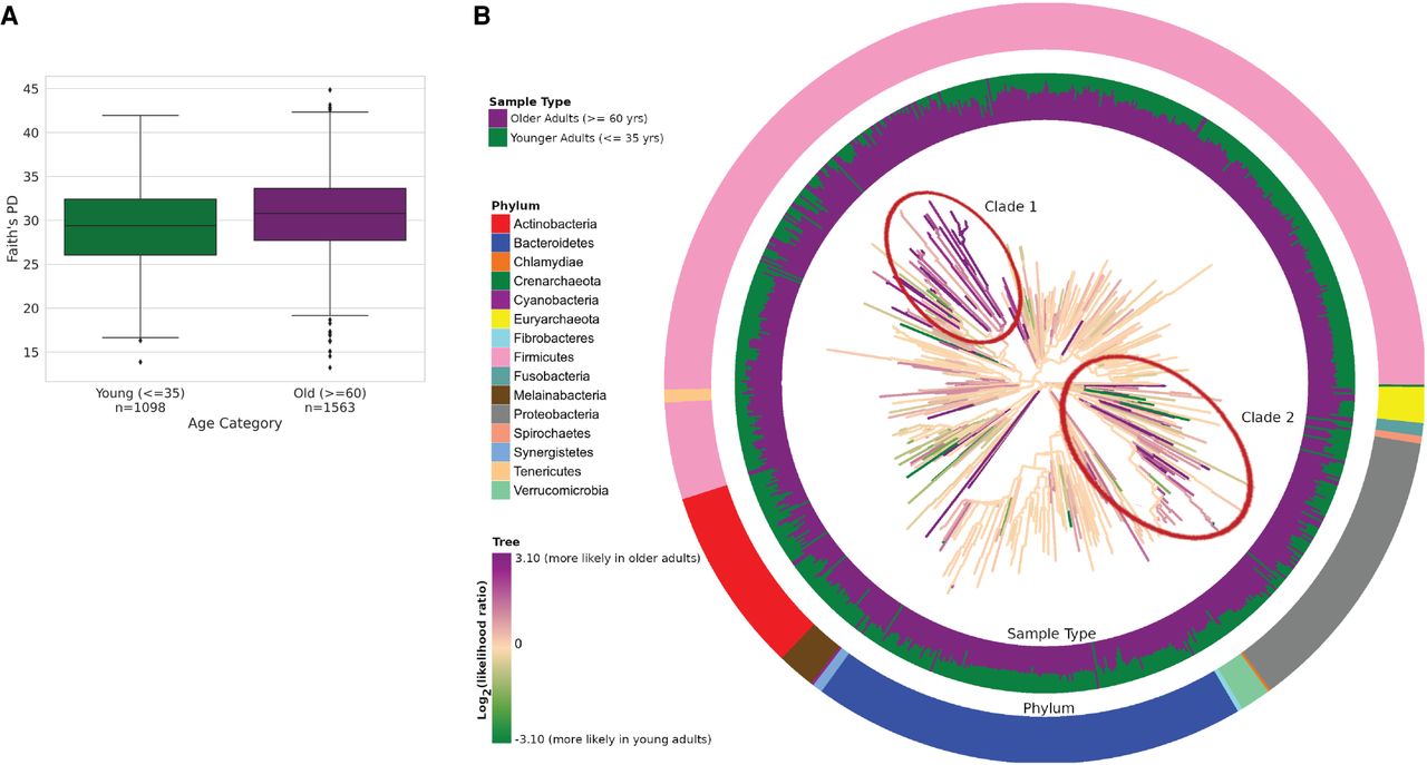 Phylogenetic tree colored by age-group log of the likelihood ratio of older to younger adults per node. (A) Distribution of Faith's PD by age group on the full data set. (B) Web of Life (WoL) phylogenetic tree with branches colored by the log of likelihood ratio of old adults compared to young adults in descendants of the branch, for the FINRISK data set. The inner circle is colored by the log of likelihood ratio of older adults compared to younger adults in the tips of the tree. The outer circle is colored by the phylum of the taxon represented by each tree tip. Red ellipses mark two clades enriched for samples from older individuals.