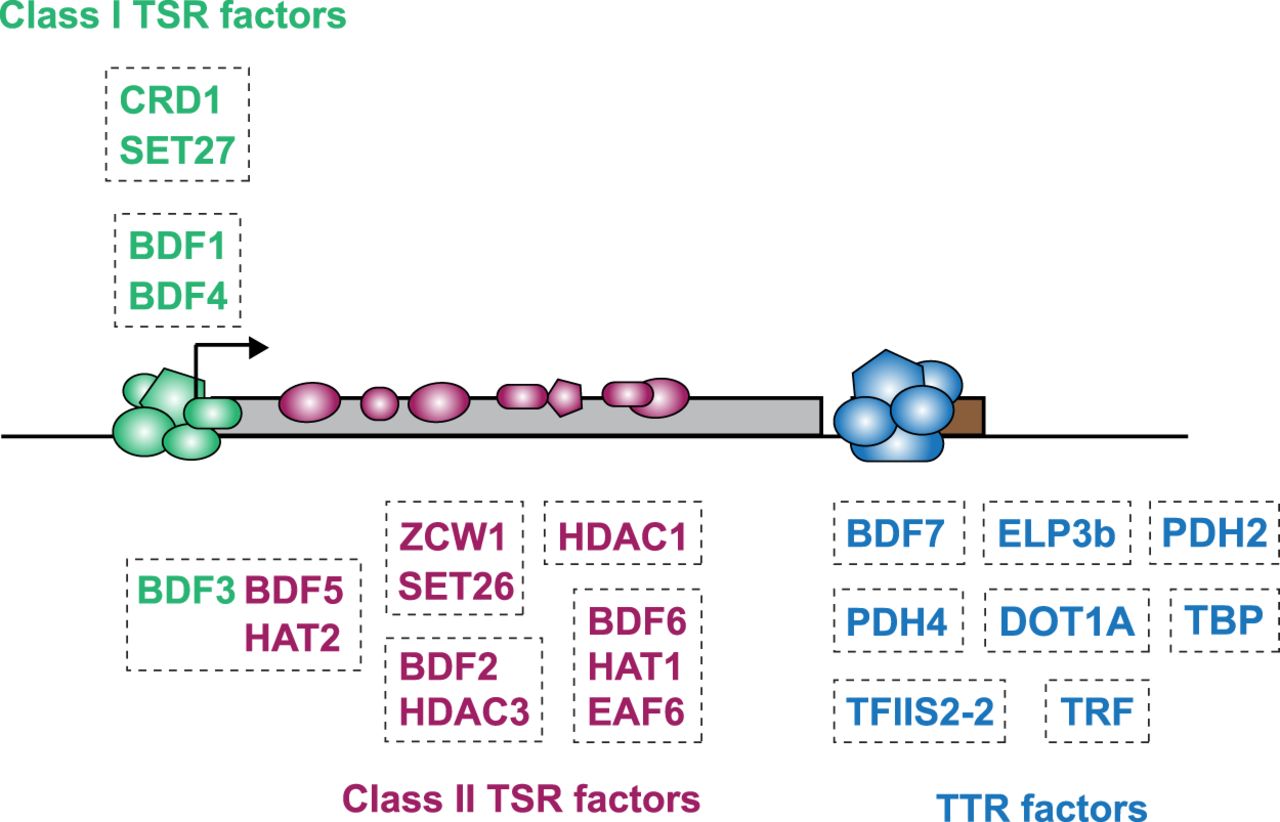 Model depicting distribution of chromatin regulators across a trypanosome polycistronic transcription unit. Diagram shows the five Class I (sharp; green) and 10 Class II (broad; purple) TSR-associated factors at a unidirectional/single RNAPII promoter. The arrow indicates the direction of transcription. The gray rectangle represents a single polycistron. Class II proteins are enriched in the direction of transcription. The eight proteins found at RNAPII TTRs associated with RNAPIII-transcribed genes are shown in blue. tRNA and snRNA genes are represented by the brown rectangle. Proteins within each box were found to interact in the proteomic experiments.