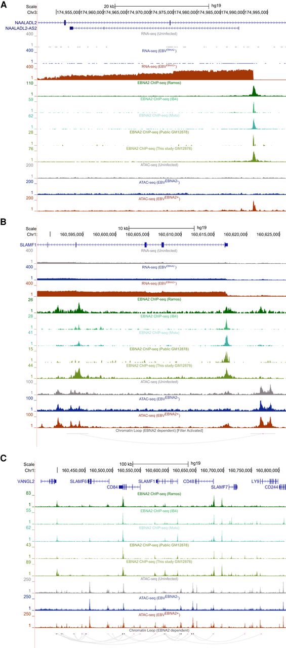 EBNA2-dependent alteration of the human chromatin landscape. (A) EBNA2 binding and EBNA2-dependent chromatin opening at the promoter of the up-regulated EBNA2 DEG NAALADL2-AS2, the most up-regulated EBNA2 DEG (UCSC Genome Browser screenshot [hg19]). (B,C) EBNA2-dependent alteration of chromatin looping at the SLAMF1 locus. (B) EBNA2-dependent looping to the promoter of the EBNA2 DEG SLAMF1. Loops outside the window are not shown. (C) Extensive EBNA2-dependent rewiring of the chromatin looping landscape at the SLAMF1 locus.