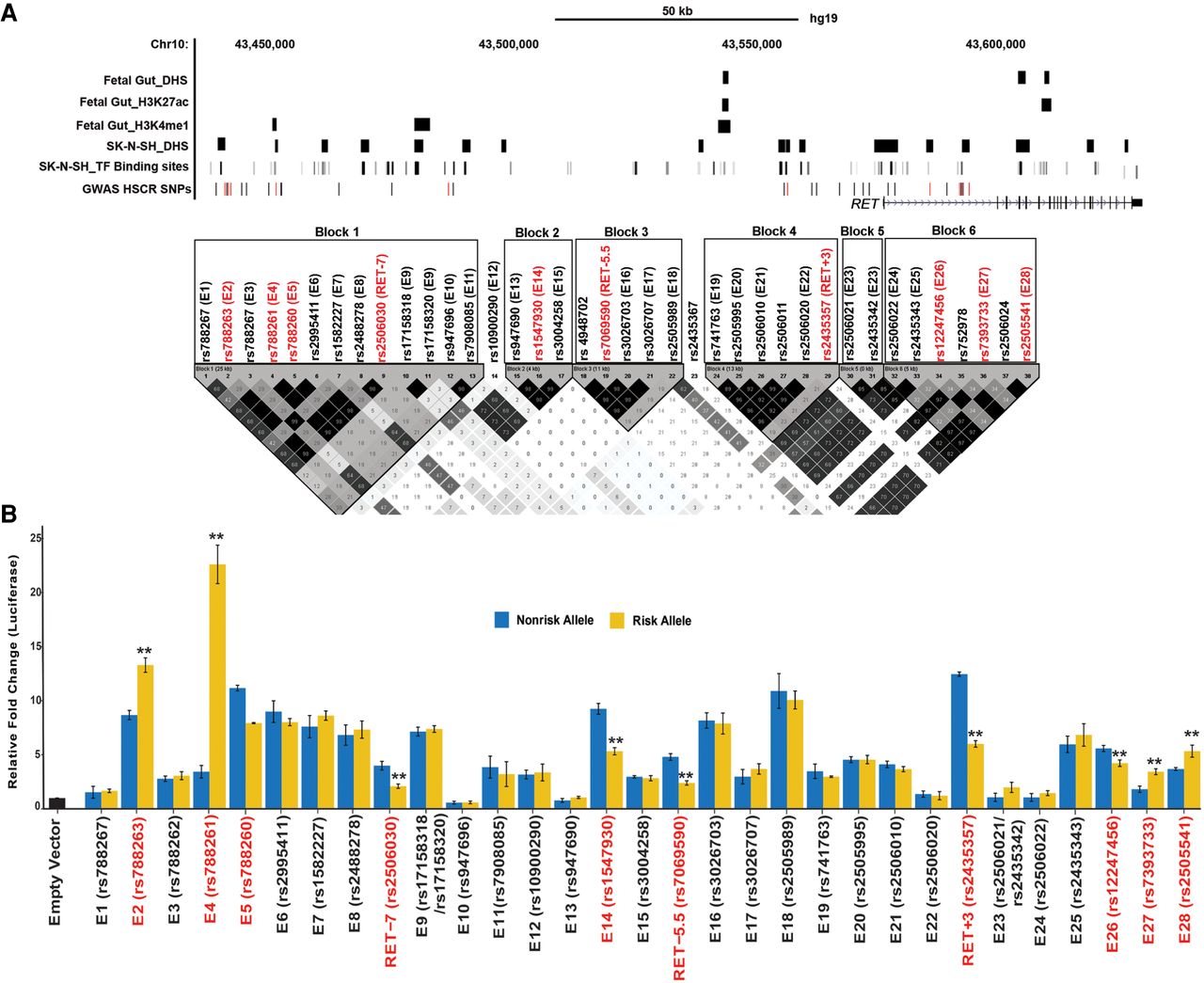 The RET regulatory landscape in the enteric nervous system. (A) The 155-kb RET locus (Chr 10: 43,434,933–43,590,368; hg19) contains 38 HSCR-associated polymorphisms in six linkage disequilibrium (LD) blocks. LD between all 38 SNPs was estimated as by Gabriel et al. (2002). Multiple enhancer-associated epigenetic marks (DNase I hypersensitivity [DHS], H3K27ac, H3K4me1) in 108-day human fetal large intestine and the SK-N-SH neuroblastoma cell line and transcription factor (TF) binding sites (TFBSs) from public sources are noted. All common (minor allele frequency ≥10%) variants associated with HSCR are shown, with those showing allelic difference in in vitro transcription assays marked in red. (B) Allele-specific in vitro luciferase assays of 28 CREs containing 30 polymorphisms plus three previously tested controls in SK-N-SH cells are shown: 22 CREs act as enhancers, compared with a promoter-only control, of which seven also show allelic difference in luciferase activity (boxed) for its cognate HSCR-associated polymorphism in addition to RET-7, RET-5.5, and RET+3 positive controls. Error bars are SEM of three independent biological replicates: (**) P < 0.001.