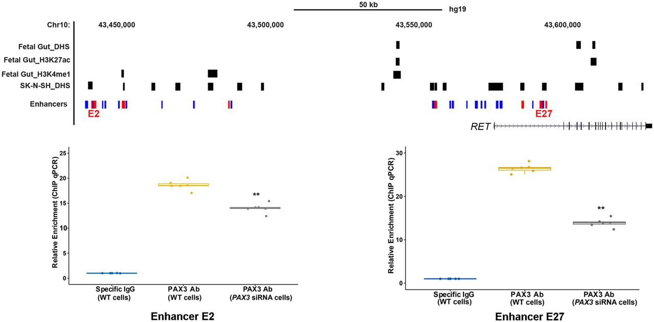 Identification of cognate TFs bound to RET enhancers. Genome map of the RET locus with locations of the E2 and E27 CREs together with ChIP-qPCR results using a PAX3 antibody in SK-N-SH cells shows enrichment of binding compared with the background. The specificity of binding is shown by siRNA knockdown of PAX3 with concomitant reduction in ChIP-qPCR signals at both CREs. (**) P < 0.001 for two technical replicates for three independent biological replicates (n = 6).