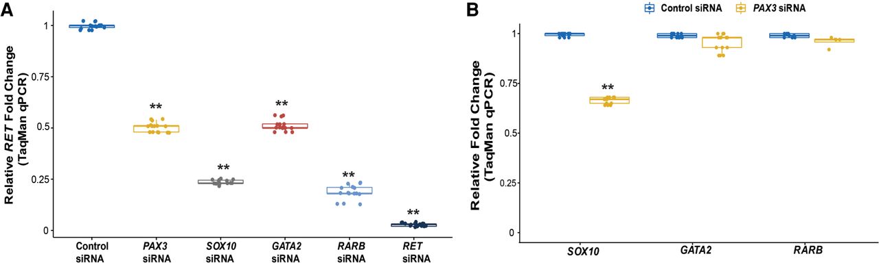 TF-mediated in vitro and in vivo effects on gene expression. (A) siRNA-mediated knockdown of PAX3, SOX10, GATA2, RARB, and RET in SK-N-SH cells decreases RET gene expression significantly. (B) siRNA-mediated knockdown of PAX3 has significant transcriptional effects on SOX10 but small yet statistically insignificant decreases on GATA2 and RARB. (**) P < 0.001 in three technical replicates for five independent biological replicates in all experiments.