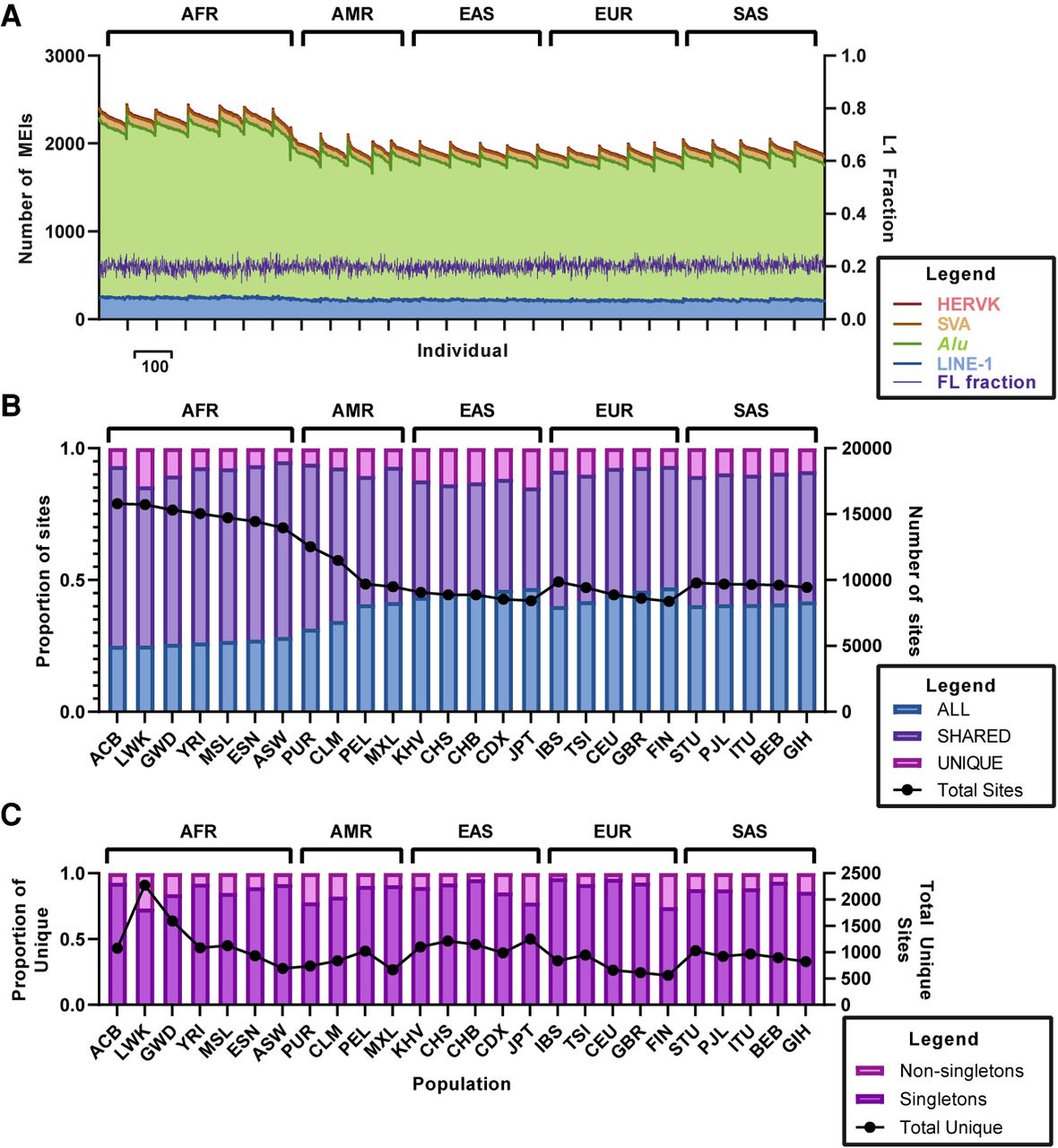 MEI counts per individual and population sharing across the 26 diverse 1KGP populations. (A) The numbers of MEIs per individual are depicted for the 26 diverse 1KGP populations: (light blue) LINE1; (light green) Alu; (light brown) SVA; (red) HERV-K. Dark lines of the same colors represent the boundaries between element classes. The dark purple line indicates the number of non-REF FL-L1Hs elements per individual. Note that the AFR populations have the highest MEI counts, consistent with previous studies (Sudmant et al. 2015). (B) Sharing of MEIs across the 26 diverse populations of the 1KGP. (C) MEIs that are unique to one of the 26 1KGP populations are broken down into singleton and non-singleton categories. We also performed similar analysis comparing the Amish, Jackson Heart Study, and the UKBB populations (Supplemental Fig. S6).