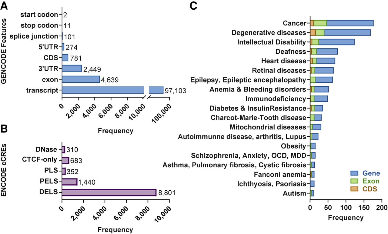 MEI mutagenesis patterns in GENCODE, ENCODE, and various databases. (A) Comparisons of the combined collection of 158,783 MEIs depicted in Figure 1B revealed intersections with GENCODE v35 gene annotations. The total number of GENCODE transcripts intersected by MEIs is 97,103. All features impacted by MEIs (exons, etc.) are found within these transcripts. The UTRs and CDSs also are included in the exon group, because they also are exons. In cases in which multiple transcript models are intersected by MEIs, all transcripts and features are listed in Supplemental Table S6A and are delimited by commas in the same order for each column. We identified insertions that disrupt various subregions of genes including 781 MEIs that disrupt CDS exon sequences. (B) MEIs disrupt ENCODE-annotated cis-candidate regulatory elements (cCREs). (C) MEIs disrupt genes that have been linked to various diseases in the Online Mendelian in Man (OMIM) database. Although all these MEIs disrupt genes and their annotated features, these insertions may or may not have functional consequences. MEIs that disrupt coding exons or ENCODE transcriptional regulators likely produce functional consequences. MEIs that occur within introns, UTRs, and other functionally important sites also can impact gene function (e.g., Watanabe et al. 2005; Lanikova et al. 2013). However, the precise functional consequences of gene-disrupting MEI insertions can be difficult to predict and must be validated experimentally.