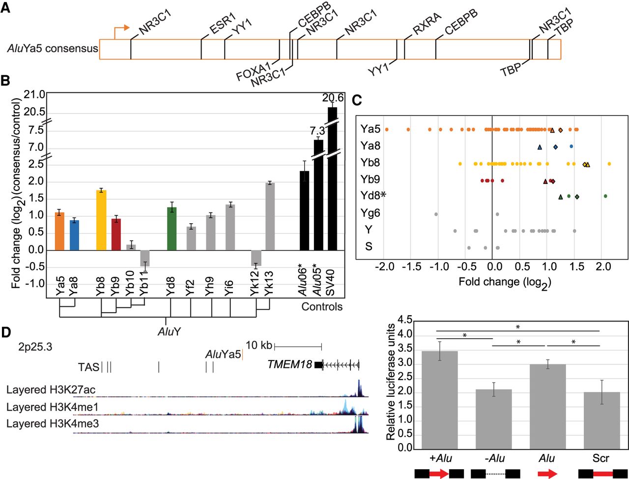 Alu elements have intrinsic regulatory potential. (A) AluYa5 has 14 high confidence putative transcription factor binding sites. (B) Ectopic luciferase assay results with isolated Alu consensus sequences. Cladogram shows the approximate evolutionary relationship between the 12 commonly polymorphic AluY subfamily consensus sequences, including five (colored) represented in our evaluated polymorphic Alu loci. Ectopic assay results for non-polymorphic, evolutionarily older Alu elements (*) previously evaluated in Su et al. (2014), and the strong SV40 enhancer are also shown (black). (C) Results from Figure 1B separated based on the Alu subfamily present at each locus. In cases where the consensus sequence was evaluated in B (matching colors), results for the consensus are shown as triangles (Alu tested sense with respect to luciferase) and diamonds (Alu consensus tested antisense with respect to luciferase). Alu subfamily does not drive the locus-specific results, as only the AluYd8 subfamily gave consistently distinct results (*) P = 0.02, ANOVA. (D, left) Genomic locus for Alu-609 drawn to scale with annotated epigenetic marks as in Figure 3. The AluYa5 (red) does not map to any notable epigenetic marks. This region was identified in GWAS as associated with obesity and body mass index (GWAS trait-associated SNPs [TAS]). Right, luciferase assay results for the locus with (+) and without (−) the Alu present compared to the isolated Alu-609 sequence (Alu). (*) Adjusted P < 0.05, t-test. Error bars are the standard deviation of two clones tested in triplicate in two experiments (n = 12).