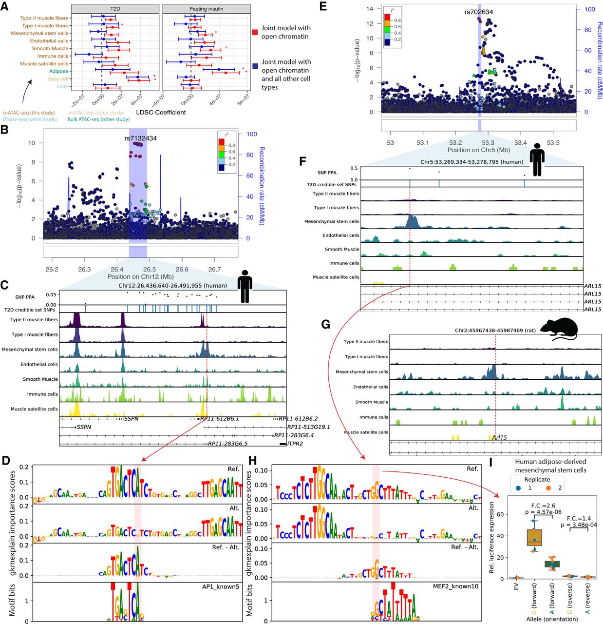 Integration of cell type–specific ATAC-seq peaks with T2D GWAS nominates causal cell types, regulatory elements, and SNPs. (A) LDSC-partitioned heritability results for T2D (BMI-unadjusted) and fasting insulin GWAS (BMI-adjusted), using human peak calls. For each cell type, one model was run adjusting for cell type–agnostic annotations from the LDSC baseline model and common open chromatin regions. Asterisks represent Bonferroni significance (P < 0.05 after adjusting for 40 tests). (B) LocusZoom plot for ITPR2 (T2D). (C) T2D credible set near the ITPR2 gene, consisting of 22 SNPs. Only SNP rs7132434 (highlighted in red) overlaps a peak call in any of the muscle cell types. (D) gkmexplain importance scores for the ref and alt allele (top two rows) and the difference between the ref and alt importance scores (third row); the G allele disrupts an AP-1 motif (bottom row). (E) LocusZoom plot for ARL15 locus (T2D). (F) T2D credible set SNPs near the ARL15 gene. The three SNPs represent the three-SNP credible set discussed in the text. One of these SNPs (rs702634; highlighted in red) overlaps a mesenchymal stem cell–specific peak. (G) Projecting the SNP highlighted in F, rs702634, into the rat genome (projected SNP position indicated by the red vertical line) shows the corresponding region has open chromatin in rat mesenchymal stem cells. (H) gkmexplain importance scores for the ref and alt alleles (top two rows), the difference between them (third row), and a MEF2 motif disrupted by the SNP. (I) Luciferase assay using a construct containing either allele of SNP rs702634 in human adipose-derived mesenchymal stem cells. Each point represents one clone; the experiment was performed twice, once on two different days (“Replicate”). P-values computed using a two-sided unpaired t-test. Copyright disclosure for rat cartoon: Rat by Francisca Arévalo from the Noun Project (https://thenounproject.com/search/?q=rat&i=15130).
