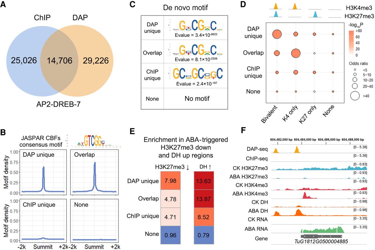 Concordance of DAP-seq and ChIP-seq peaks. (A) Venn diagrams showing the overlap between ChIP-seq peaks, DAP-seq peaks of AP2-DREB-7, and DHS. (B) Average number of AP2 motifs (bin size = 50 bp) within a 4-kb window centered on common and unique peak summits. The CBF binding motif in the JASPAR plant database is used because CBF is the orthologous gene of Tu AP2-DREB-7 in Arabidopsis. Four CBF binding motifs in the JASPAR database were merged into a consensus motif. (C) Motifs de novo identified from common and unique peaks. (D) Enrichment of histone marks in common and unique peaks. H3K4me3 and H3K27me3 overlapping (bivalent) peaks and unique peaks (K4-only and K27-only) were used for the analysis. (E) Enrichment of DAP-seq unique peaks in H3K27me3 down-regulated and DNase I hypersensitivity (DH) up-regulated regions by ABA. The MAnorm package (Shao et al. 2012) was used for the quantitative comparison of H3K27me3 ChIP-seq and DHS signals between samples. (F) Genomic tracks illustrating the coincidence between DAP-seq unique binding and ABA-induced chromatin accessibility and reduced H3K27me3. TuG1812G0500004885 is a gene with LRR domains which may relate to biotic or abiotic stress responses.