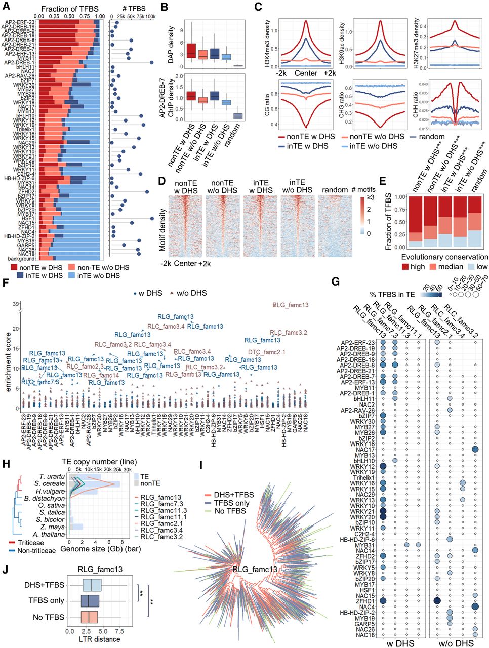 Pervasive association of TFBSs and TEs in Tu. (A) Proportion of the TFBSs that occurred in TEs with (dark blue) or without (light blue) DHSs and non-TE regions with (dark red) or without (light red) DHSs. The numbers of all TFBSs are shown on the right. (B) DAP-seq density and AP2-DREB-7 ChIP-seq density distribution of non-TE TFBSs and TE-embedded TFBSs with or without DHSs. (C) Epigenetic profiles of TE-embedded and non-TE TFBSs. All figures represent the average signal density at 50-bp resolution within a 4-kb window centered on peak summits. Top panel: Regulatory histone marks, including H3K4me3, H3K27me3, and H3K9ac. Bottom panel: DNA methylation levels in three contexts. (D,E) Distribution of motifs (D) and conservation levels (E) in non-TE TFBSs and TE-embedded TFBSs with or without DHSs. (D) The number of motif occurrences (bin size 50 bp) within a 4-kb window centered on the merged TFBS centers. The unions of the primary motifs of these TFs were used. (E) Conservation score is a measure of sequence conservation across wheat species. The 0.33 quantile (0.16) and 0.66 quantile (0.25) of the conservation score of all peaks were used to define the degree of conservation. 0 < score < 0.16 for low conservation, 0.16 ≤ score < 0.25 for median conservation, score ≥0.25 for high conservation. For each TFBS set, the number of the TFBSs in each conservation category was compared with a randomly selected set using a χ2 test. (***) P < 0.001. (F) Specific TE families enriched among TFBSs. Blue dots and brown triangles represent families contributed to TE-embedded TFBS overlapping and not overlapping with DHSs, respectively. Highly enriched TE families (enrichment score > 9) are labeled with family names. (G) Percentage of TFBSs in TE-embedded regions with or without DHSs. The color range and circle size represent the percentage of TFBSs overlapping with TEs. (H) TE copy number (line plot) of each family (represented by different colors) during evolution. The genome sizes are shown as a bar plot, light blue representing TEs and light gray representing non-TEs. (I) Dendrogram showing the sequence similarity between RLG family 13 members. (J) Age of different groups of RLG family 13 measured by sequence similarity of LTR from both ends. A Wilcoxon signed-rank test was used to compare the LTR distance of different groups. (**) P < 0.01 (H1: the LTR sequence of TEs with DHSs and TFBSs were more divergent than other TEs).