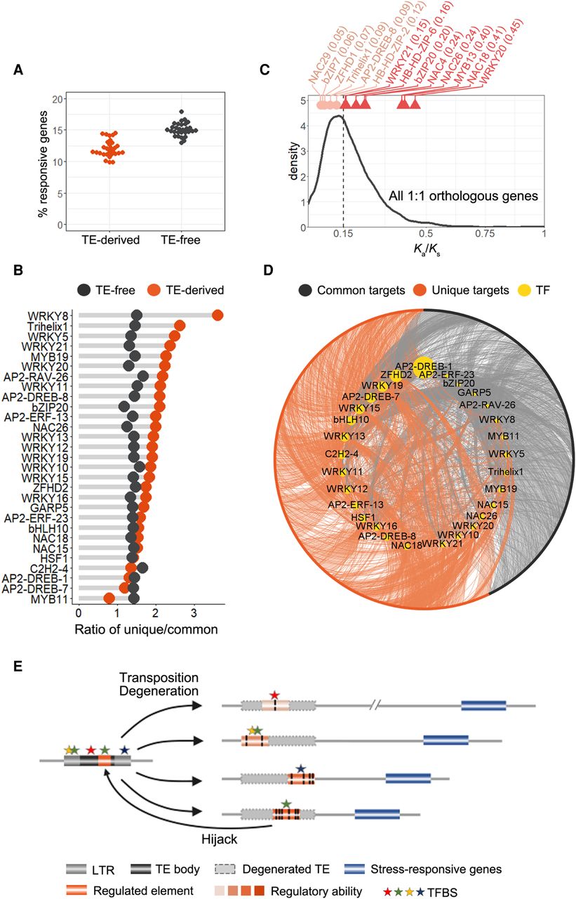 TE-derived TFBSs have wired new genes into the regulatory network of wheat environmental responses. (A) Fraction of TE-derived TFBSs and TE-free TF targets induced by abiotic stresses. (B) Ratio of unique response genes in wheat and commonly induced genes in Tu and Os. Orange spots represent TE-derived TFBSs. Black spots represent TE-free TFBSs. The TFs with the number of targets induced by abiotic stresses greater than 20 were kept. (C) Ka/Ks ratio of TFs between Os and Tu. The values for 1:1 orthologous TFs are shown on top, and the line plot represents the background of Ka/Ks distribution for all 1:1 orthologous genes between Os and Tu. TFs with Ka/Ks ratios greater than the median of all 1:1 orthologous genes are in dark orange; other TFs displayed in light orange. (D) Network showing incorporation of new stress-responsive genes by TE-derived TFBSs. TEs in A are shown. (E) Model illustrating the rewiring of the gene regulatory network by TE-derived TFBSs. Left: Some TFBSs or TFBS precursors exist within specific TEs, transposition of which leads to expansion of corresponding TFBSs or precursors. Right: Transposed TEs were degenerated and lost typical TE structures, but some TFBSs present in TEs were evolutionarily selected for regulating nearby gene activity. The closer the TE-derived TFBS to genes, the stronger the regulatory activity. The reverse arrow at the bottom illustrates that some TE-embedded TFBSs may be hijacked from the non-TE TFBSs.