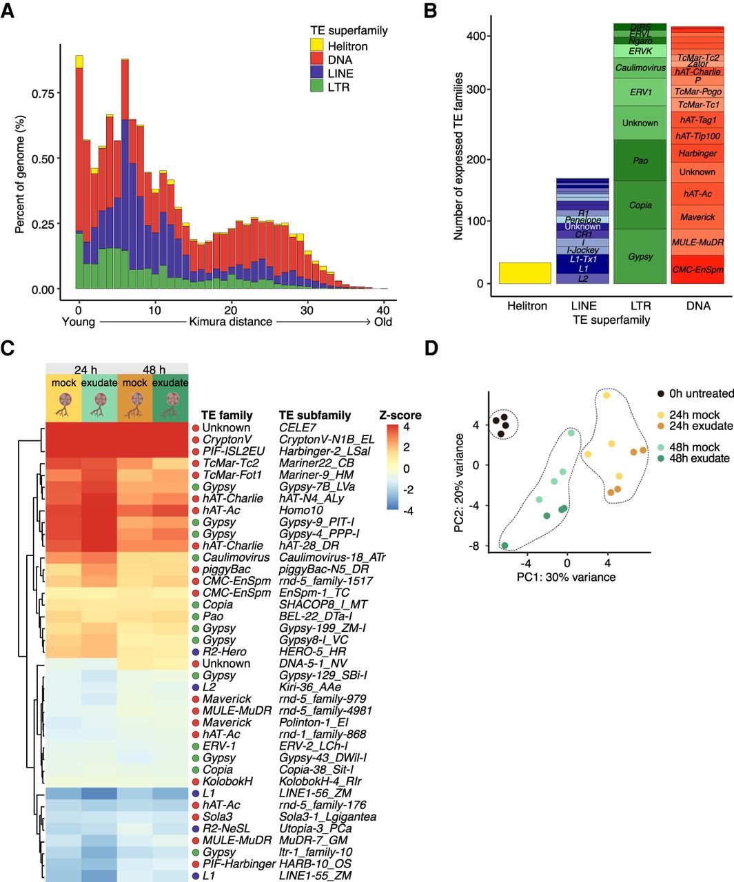 Transposon expression during R. irregularis spore development. (A) Repeat landscapes showing Kimura distance-based copy divergence analysis of TEs in R. irregularis genome shown as genome coverage (%) for each TE superfamily plotted against Kimura distance. Clustering was performed according to their Kimura distances of TEs (CpG adjusted K-value from 0 to 50). TE copies with a low Kimura distance value have a low divergence from the consensus sequence and may correspond to recent replication events. Sequences with a higher Kimura distance value corresponded to older divergence. Note that we omitted unclassified elements. (For repeat landscape including unclassified elements, see Supplemental Fig. S1.) (B) Number of expressed transposon subfamilies, grouped superfamilies. (C) Heat map and hierarchical clustering of differentially expressed TE subfamilies (|log2FC| > 0.5; FDR < 0.05) in the spore developmental assay. Five conditions were used in total, a 0-h control treatment, 24-h mock and rice exudate treatments, and 48-h mock and rice exudate treatments (four replicates per treatment). Expression of 24-h and 48-h conditions were normalized against expression in the control, 0-h condition. (D) Principal component analysis of TE subfamily expression across all replicates and conditions.