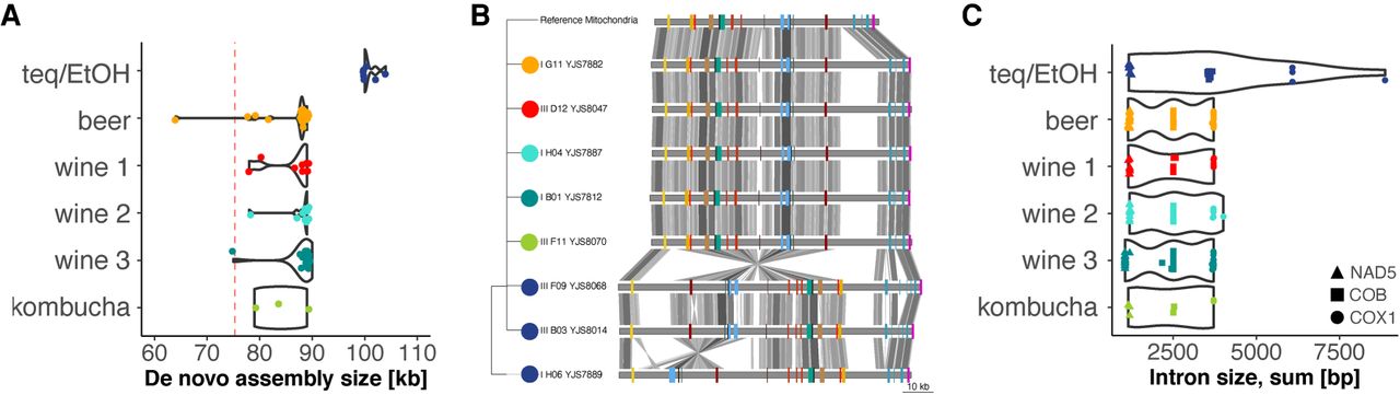 De novo assemblies for the mitochondria reveal its expansion in all subpopulations and high level of reorganization for the teq/EtOH strains. (A) De novo assembly size difference. All subpopulations increased their mitochondrial genome compared to the reference genome (accession number GQ354526.1), from 75.3 to 88–90 kb. The teq/EtOH subpopulation stands out with de novo assembly sizes >100 kb. Red dotted line denotes the mitochondrial size of the reference genome. (B) Mitochondrial synteny. Synteny is conserved among subpopulations (compared to the reference), with the exception for the teq/EtOH subpopulation. Additionally, synteny within teq/EtOH was not congruent among strains. Here, the strain I_H06_YJS7889 harbors a large inversion. (C) Intron content contributes to genome expansion of teq/EtOH subpopulation. For teq/EtOH strains, the two protein-coding genes COB and COX1 have increased in intron content, whereas other subpopulations have the expected intron sizes compared to the reference genome (accession number GQ354526.1).