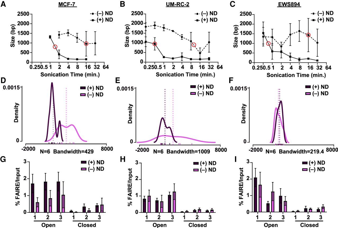 Nanodroplets facilitate extraction of high-quality chromatin from cross-linked cells. (A–C) Peak DNA fragment size (base pairs, y-axis) after sonication time (minutes, x-axis) for MCF-7, UM-RC-2, and EWS894cells (Agilent TapeStation 2200). Data represent the average of three biological replicate samples sonicated with (solid line) or without (dashed line) nanodroplets (ND). Red circles indicate the time point at which peak DNA size reached the target range of 750–1000 bp. (D–F) Density distribution of fragment sizes for FAIRE input DNA with and without nanodroplets from MCF-7, UM-RC-2, and EWS894 cells, respectively, at data points circled (in red) in A, B, and C, respectively. Actual fragment lengths for each of six replicates within each group delineated with rug plot beneath density plots (without nanodroplets, lavender; with nanodroplet, dark purple). Bandwidth for each density plot displayed beneath each graph. Average fragment length within each group per cell line is displayed by dotted vertical lines. (G–I) Percent FAIRE-qPCR signal over input with (dark purple) and without nanodroplets (lavender) from MCF-7, UM-RC-2, and EWS894 cells, respectively, at data points circled (in red) in A, B, C, respectively. (Open) regions of known accessible chromatin; (Closed) regions of known inaccessible chromatin.