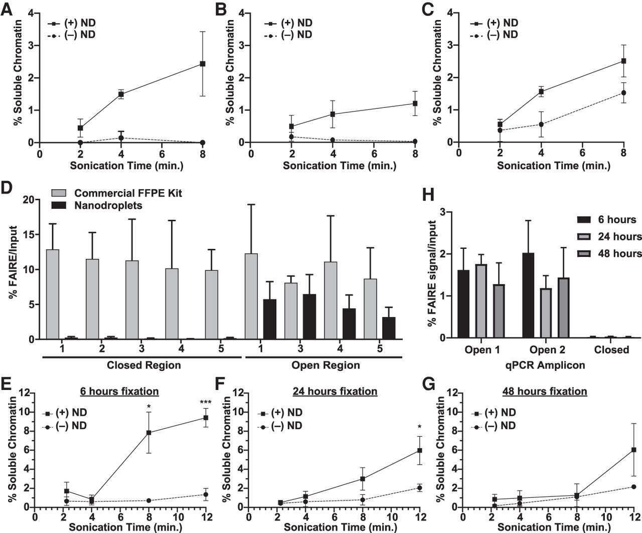 Nanodroplets facilitate the extraction of chromatin from archival tissue. Percent soluble chromatin from one 10-µm section of UM-RC-2 (A), EWS894 (B), and MDA-MB-231 (C) following sonication with (solid) or without (dashed line) for indicated. (D) FAIRE-qPCR was performed on chromatin prepared from EWS894 xenograft tumor tissue with a commercial FFPE chromatin preparation kit (eight 10-µm sections, gray bars) or with nanodroplets (one 10-µm section, black bars). The y-axis indicates the percent FAIRE signal compared to input signal by qPCR. (Open) regions of known accessible chromatin; (Closed) regions of known inaccessible chromatin. (E–H) Xenograft tumor tissue derived from MCF-7 cells was fixed for 6 h (E), 24 h (F), or 48 h (G), and one, 10-μm section of each was deparaffinized, rehydrated, and sonicated with (solid line) or without (dashed line) nanodroplets for indicated time (x-axis, minutes). Percent soluble chromatin (y-axis) was measured by comparing the quantity of DNA in the soluble fraction to that of the insoluble pellet fraction. (H) FAIRE-qPCR was performed on one, 10-µm tissue section sonicated for 8 min with nanodroplets for each fixation time point. The y-axis indicates the percent FAIRE signal compared to input signal by qPCR. (Open) regions of known accessible chromatin; (Closed) regions of known inaccessible chromatin.