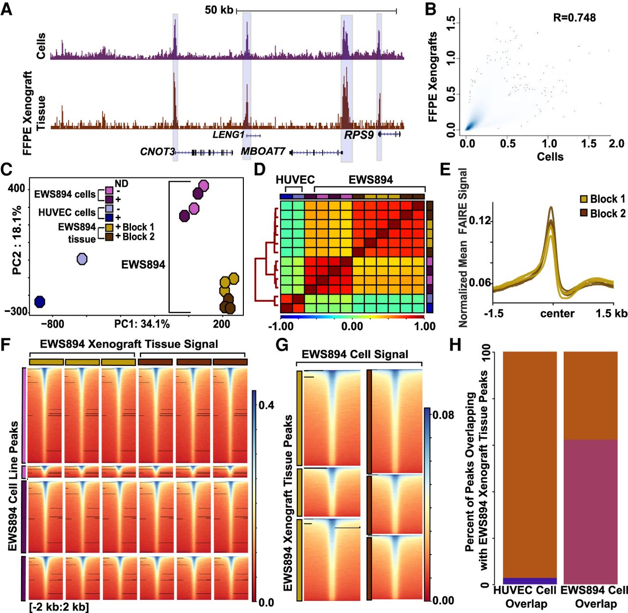 Nanodroplet FAIRE identifies cell-type-specific regions of accessible chromatin from FFPE xenograft tissue. (A) Normalized FAIRE-seq sequencing tracks of EWS894 cell line signal (FAIRE replicates with and without nanodroplets combined) and EWS894 xenograft FFPE tissue (two tissue blocks, three replicates each, combined). Cell line signal depicted in purple, FFPE tissue signal in brown. Regions of enrichment shared across all tracks are highlighted in blue. (B) Correlation of genome-wide signal (300-bp windows), between EWS894 cells (replicates pooled), and EWS894 xenograft tissue (replicates and blocks pooled). Spearman's correlation coefficient is shown. (C) Top two principal components of mean FAIRE-seq signal in the union set of peaks called across all data sets, EWS894 cells (lavender, without nanodroplets; purple, with nanodroplets), EWS894 xenograft tissue (gold, FFPE block 1; brown, FFPE block 2), and HUVEC cell lines (sky blue, without nanodroplets; blue, with nanodroplets). Each symbol represents a FAIRE-seq data set. (D) Spearman's correlation of mean FAIRE-seq signal in union set of peaks called across all replicates in EWS894 (cells and xenografts) and HUVEC (cells). Distances across samples depicted by tree on left, determined by the nearest point algorithm. (E) Normalized mean EWS894 FFPE FAIRE signal in Block 1 (gold) and Block 2 (brown) replicates at all transcription start sites with non-zero signal genome-wide. Enrichment 3 kb around transcription start sites is shown. (F) Heatmap of signal in xenografts tissue replicates 4 kb around center of replicate-specific regions of enrichment identified in EWS894 cell data sets. (G) Mean normalized FAIRE-seq signal in EWS894 cell FAIRE (all replicates pooled), 4 kb around the center of FFPE tissue-replicate-specific regions of enrichment sets from Block 1 (gold) and Block 2 (brown), three replicates each. (H) Bar plot of the percentage of HUVEC cell peaks (all replicates pooled, blue) and EWS894 cell peaks (all replicates pooled, purple) that overlap with EWS894 xenograft peaks called (all replicates pooled, brown).
