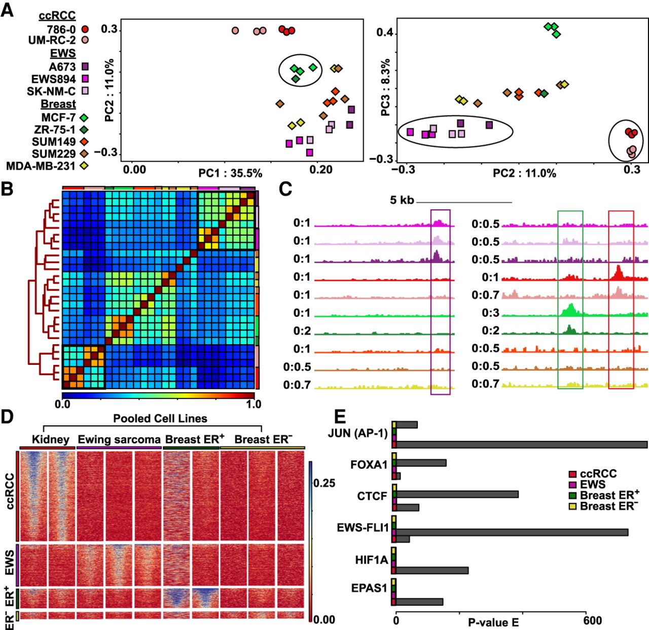 Nanodroplet FAIRE identifies tumor-type-specific chromatin signatures from xenograft FFPE tissue. (A) Top three principal components from mean signal in union set of regions of enrichment called across all xenograft carcinoma tissue blocks. Tumor categories defined by symbols: (circles) ccRCC; (squares) EWS894; (diamonds) breast carcinoma. Number of blocks per cell line: 786-0, n = 3; UM-RC-2, n = 3; A673, n = 2; EWS894, n = 3; SK-NM-C, n = 3; MCF-7, n = 3; ZR-75-1, n = 1; SUM149, n = 3; SUM229, n = 3; MDA-MB-231, n = 3). Xenograft replicates defined by colors. Clustering of ccRCC group, breast ER+ group, and EWS894 group highlighted within PCA by black circles. (B) Spearman's correlation heatmap of mean signal in union set of regions of enrichment called across all xenograft tissue replicates. Xenografts are color coded by cell line outside the heatmap perimeter (top and right); color coding matches legend defined in A. Clustering distance tree across all replicates depicted on the left of the heatmap. Legend of correlation coefficient scores depicted at the bottom of the heatmap. Clusters of tumor-type-specific cell lines defined by tree nodes highlighted with black boxes within the heatmap. (C) Examples of regions of enrichment from within the EWS894, breast ER+, and ccRCC TSRs (tumor-type-specific regions). Replicates for each xenograft pooled into one signal track. Tracks colored by xenograft to match legend defined in A. Signal at depicted signature regions across all cell line tracks highlighted within box (Ewing sarcoma signature region defined by purple box, breast ER+ region by green box, ccRCC region by red box). (D) Heatmap of xenograft tissue FAIRE signal at each TSR. TSRs defined on the left with each region as a row; pooled xenografts grouped by tumor type define columns. Each TSR heatmap is sorted by signal in the first cell line within that tumor type category. (E) Motifs enriched at TSR. P-value of enrichment for each motif within each TSR displayed for six relevant transcription factors.