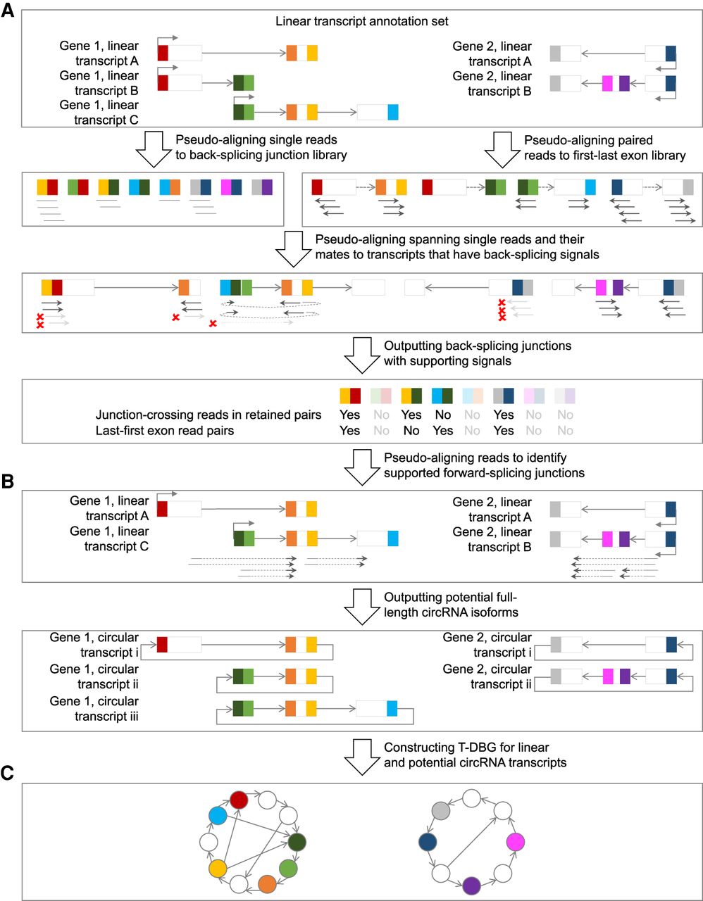 The psirc method. In the first step (A), sequencing reads are pseudoaligned to potential BSJs in single-end mode and to the first and last exons of each transcript in paired-end mode. For each read that is pseudoaligned to a BSJ (by means of rotating the end of the downstream exon to the beginning of the upstream exon), if its mate read is not pseudoaligned to the same transcript or not pseudoaligned in the opposite orientation, both of them will not be considered to support the BSJs (arrows in light gray with a red cross next to them). In the second step (B), the potential circRNA transcript isoforms are determined as those with all forward-splicing and backward-splicing junctions supported by sequencing reads. In the third step (C), a T-DBG is constructed for all linear and circular transcript isoforms for estimating their expression levels by another round of pseudoalignment.