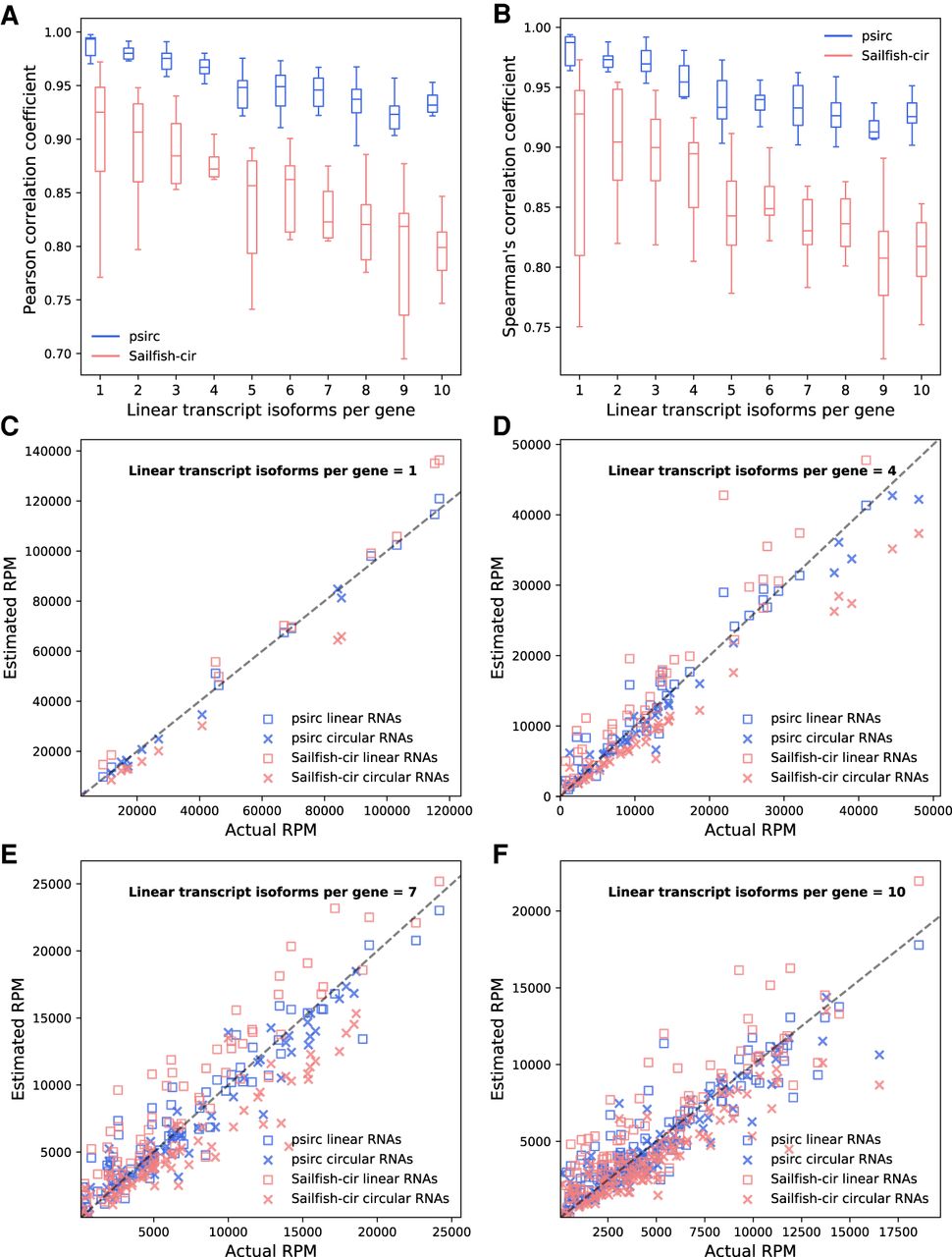 Quantification performance of psirc and Sailfish-cir on the second simulated data set. Pearson (A) and Spearman's (B) correlation coefficients were computed between the estimated and actual expression levels. Each box plot shows the distribution of correlations from the 10 sets of random transcripts, with each correlation coefficient computed based on all the transcripts from the 10 genes in that set. (C–F) The estimated and actual read counts per million reads aligned are shown for each transcript isoform for the gene that Sailfish-cir achieved the strongest Pearson correlation in each group, when each gene had one (C), four (D), seven (E), or 10 (F) linear isoforms per gene.