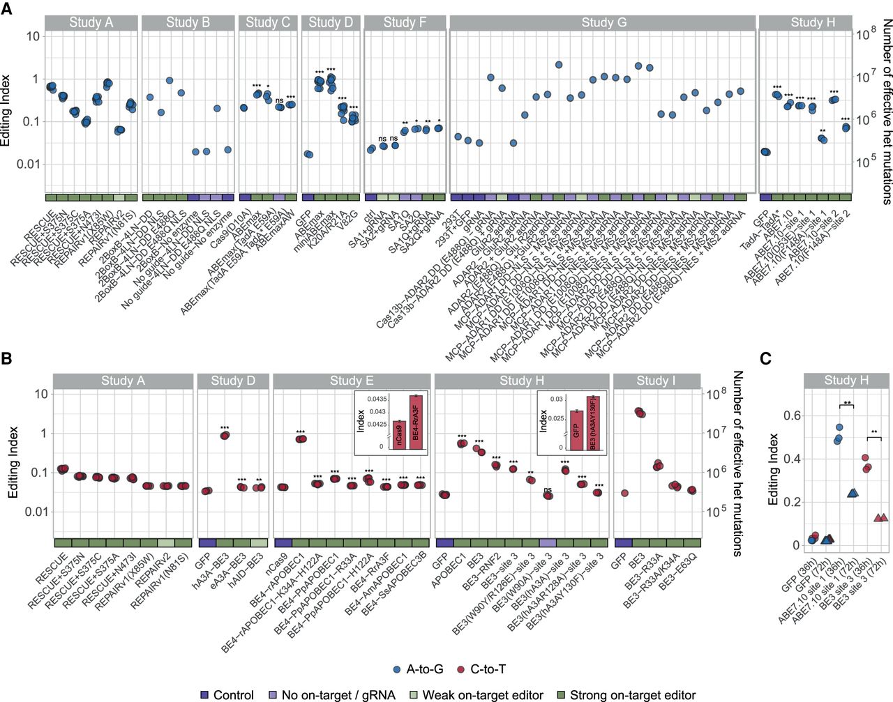Editing activity is globally enhanced following introduction of base editors. The editing index is a global measure of editing activity, quantifying the fraction (percent) of the RNA nucleotides exhibiting a DNA-RNA mismatch (i.e., A-to-G index of 1 means that 1% of the RNA nucleotides mapped to a genomic adenine are guanosines). (A) For adenine base editors (Studies A, B, C, D, F, G, H), the A-to-G index (blue circles) per sample over the coding sequence is presented (see Supplemental Fig. S3 for whole-genome calculation). In almost all cases tested, the index is significantly elevated for base editors compared to the control samples. Two-sided t-test for log(index); (*) P < 0.05, (**) P < 0.01, (***) P < 0.001. Significance was not assessed for Study A (did not include untreated controls) and Studies B and G (only one replicate per condition). The two cases in Study F that do not show a significant difference exhibit weak on-target activity as well. In order to appreciate the significance of the high index values obtained, the index values are translated into an equivalent number of heterozygous mutations (Methods), right axis. Note that the index cannot be directly compared between samples of different reads’ lengths (Methods). (B) Same as A; C-to-U index (red) for cytidine deaminase samples (Studies A, D, E, H, I). (C) Samples sequenced 36 h posttreatment show a two- to threefold higher level of induced mutations compared to ones sequenced 72 h posttreatment (as are all samples in panels A,B). The data per sample are available in Supplemental Table S2. Exact P-values are presented in Supplemental Table S3.