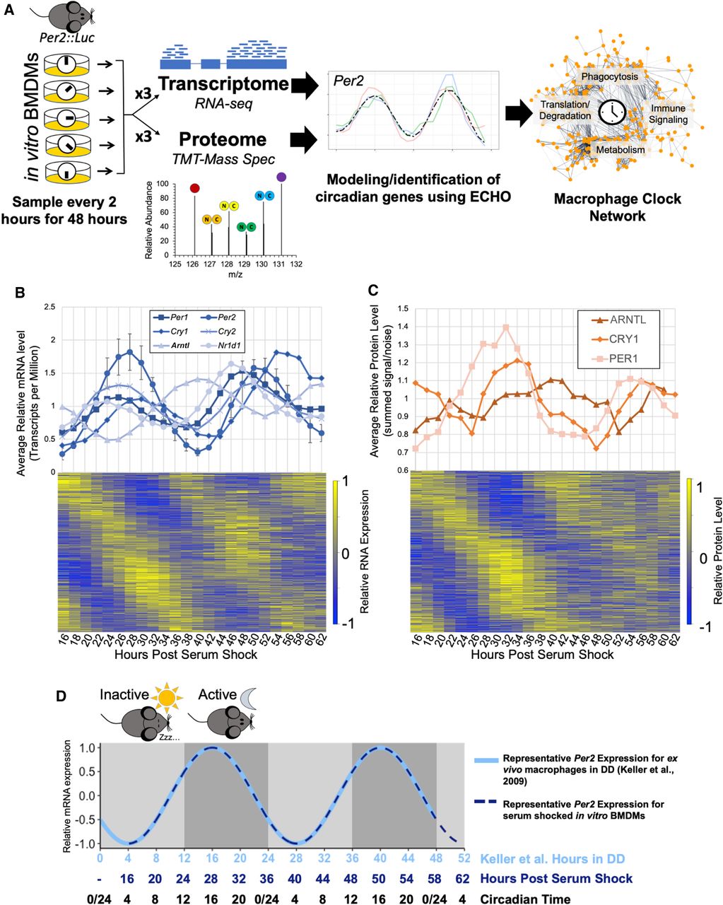 Multi-omics profiling details extensive circadian regulation of the macrophage transcriptome and proteome. (A) A schematic of the analysis of macrophage circadian regulation. Bone marrow derived macrophages (BMDMs) from Per2::Luc mice were synchronized in vitro via serum shock and sampled in triplicate for global proteome and transcriptome profiling with 10-plex tandem mass tag mass spectrometry and RNA-seq, respectively. Circadianly oscillating genes were identified using the ECHO program to determine the macrophage circadian protein–protein interaction network. (B) All detected clock gene transcripts oscillated circadianly, and error bars show the standard deviation for Per2 as a representative gene for the variation between triplicate values. Heat map in bottom panel shows relative expression for all identified circadian transcripts. (C) All detected clock proteins exhibited circadian abundances with delay from their respective transcripts. Points shown are an average of the summed signal/noise of peptides for the identified protein for up to three replicates depending on the detection at the given time point. Heat map in bottom panel shows relative expression for all identified circadian proteins. (D) A schematic summarizing how circadian time (CT) for our in vitro synchronized experimentation was inferred from comparison of Per2 mRNA oscillation timing we observed to the oscillation of Per2 mRNA reported in macrophages extracted from light-entrained mice transferred to constant dark conditions (Keller et al. 2009). Shading represents the relative inactive period (light gray) and active periods (dark gray) during the Dark:Dark (DD) experiment by Keller et al. Because mice are nocturnal, CT0/24 is the onset of the inactive period and CT12 is the onset of the active period.