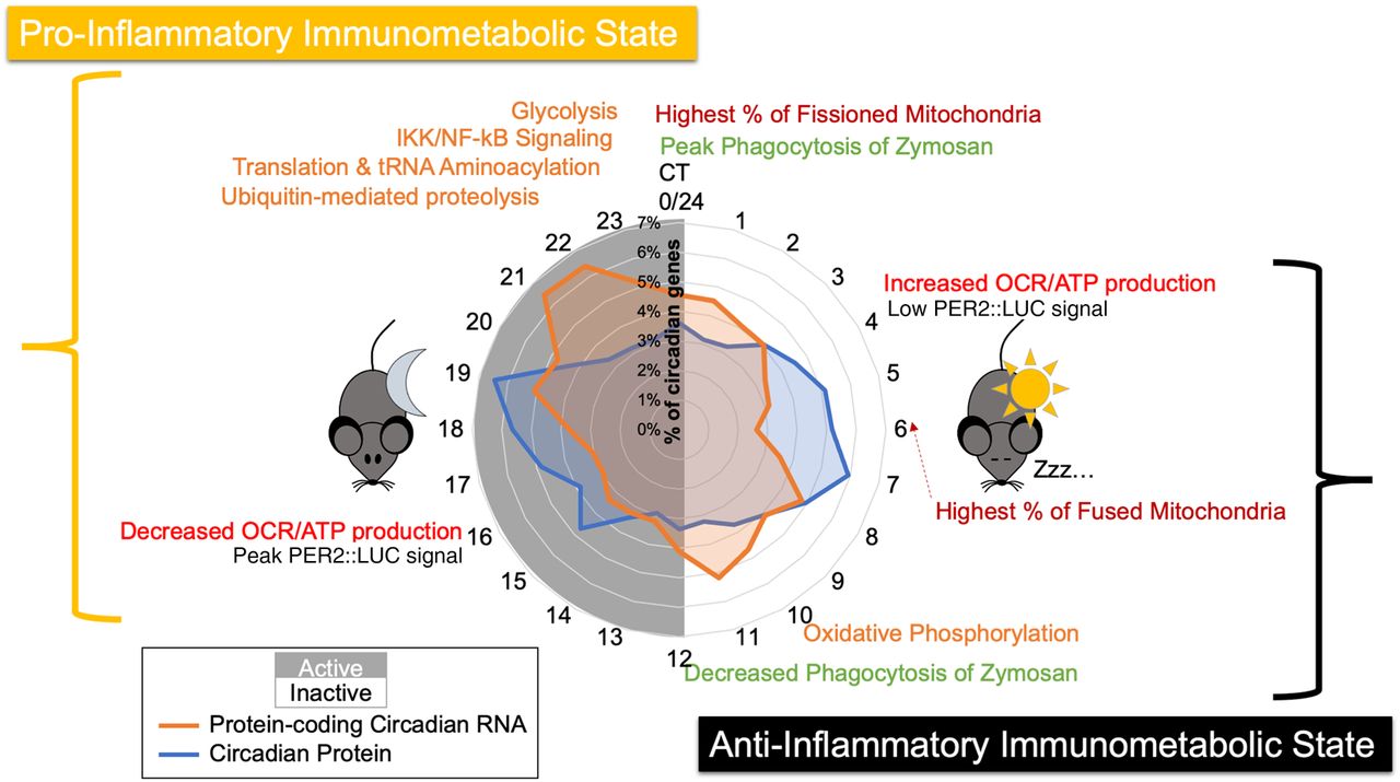 Summary model of the circadian regulation of distinct immunometabolic states. A summary schematic displaying key findings, spatially organized by circadian time of day, with a radial histogram in the center to indicate when circadian proteins and circadian mRNAs peak in abundance. Orange text represents enriched categories identified in the proteome, red represents the occurrence of mitochondrial morphology/functional observations, green represents phagocytosis assay observations, and black text shows the trough and peak of PER2 levels as determined by PER2::LUC luminescence signal. For reference, Post Shock 16, our first time course time point, is equivalent to CT4, as described in Figure 1D.