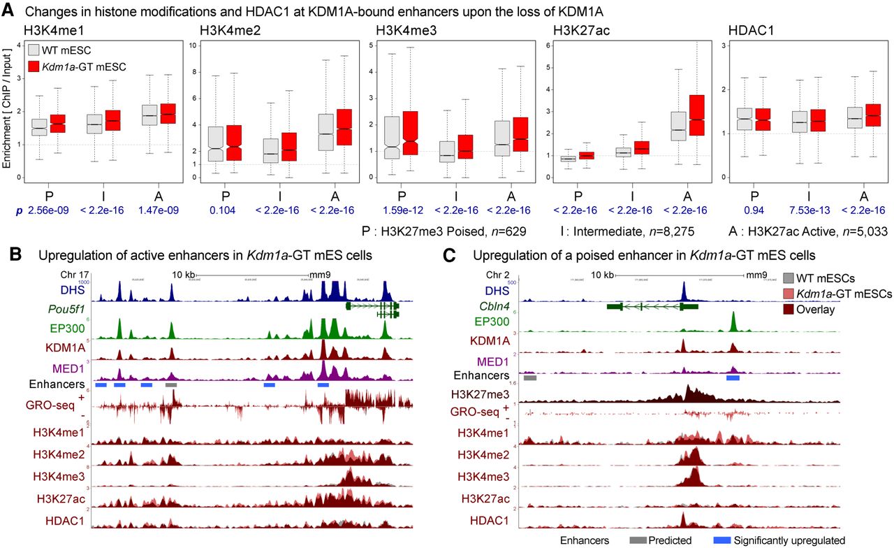 Loss of KDM1A results in increases in H3K4 methylation and H3K27 acetylation at enhancers. (A) H3K4me1, H3K4me2, H3K4me3, H3K27ac, and HDAC1 levels on KDM1A-bound enhancers in WT (gray boxes) and Kdm1a-GT mESCs (red boxes). Enhancers were classified into poised (P), intermediate (I), and active (A) enhancers based on the enrichment of either H3K27ac or H3K27me3. Geometric mean of ChIP:Input ratios from the two independent ChIP-seq replicates are shown. P-values (p) from Wilcoxon signed-rank tests on log2(Kdm1a-GT/WT) are denoted in blue beneath each panel. n indicates the number of enhancers in each category. (B) Dysregulation of active enhancers at the Pou5f1 locus. Several enhancers are co-occupied by EP300 and KDM1A in WT mESCs, some of which show increased H3K4me2, H3K27ac, and GRO-seq signals in Kdm1a-GT mESCs (red vs. gray). (C) Misregulation of a poised enhancer at the Cbln4 locus. This locus is decorated with a broad H3K27me3 domain and shows elevations in H3K4me1, H3K4me2, and GRO-seq signals upon the loss of KDM1A. Gray bar: Predicted enhancer, blue bar: significantly up-regulated enhancer in Kdm1a-GT mESCs compared with WT mESCs based on changes in the GRO-seq signal (see Fig. 3).