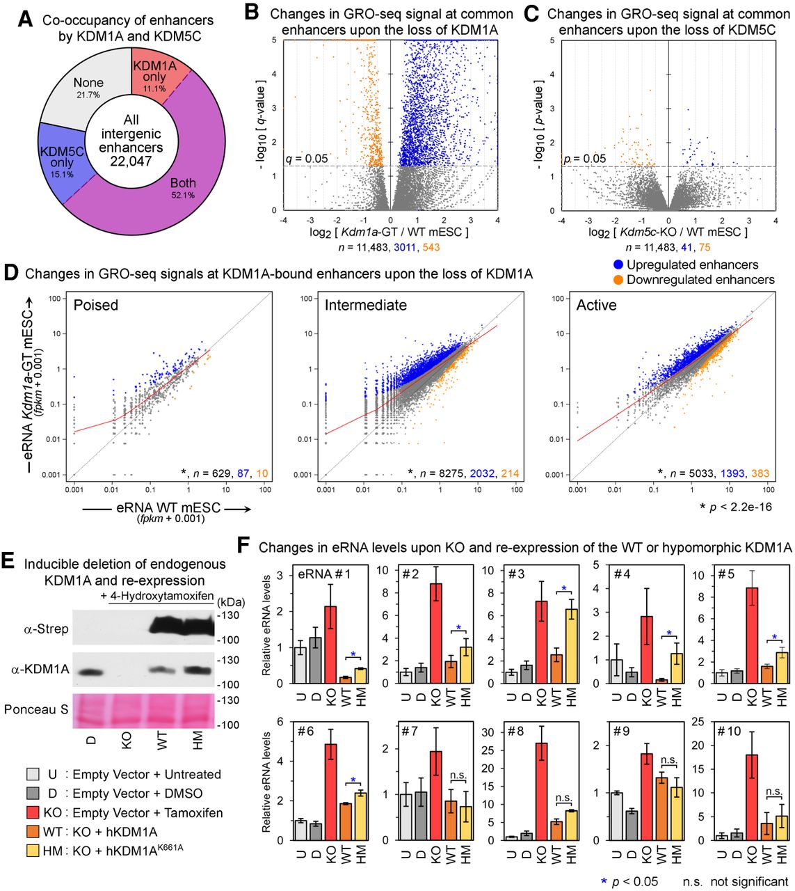 Loss of KDM1A but not KDM5C results in aberrant activation of enhancers. (A) Fractions of intergenic enhancers bound by KDM1A and/or KDM5C in mESCs. (B,C) Volcano plots of GRO-seq signals at enhancers bound by both KDM1A and KDM5C from DESeq analyses. Whereas the loss of KDM1A resulted in a large-scale increase in GRO-seq signals at enhancers, the deletion of KDM5C had a minimal impact. The x-axis and y-axis indicate the log2 fold-change and significance, respectively, of differential expression in WT and mutant mESC lines. (D) Scatterplots of GRO-seq levels at KDM1A-bound poised, intermediate, and active enhancers. Significantly up-regulated and down-regulated enhancers (q < 0.05, DESeq) are shown in blue and orange, respectively. The LOWESS curve for each class of enhancers is shown in red. The total number (n) of all, significantly up-regulated, and significantly down-regulated enhancers in each group are indicated in black, blue, and orange, respectively. Each class of enhancers shows a significant up-regulation (P < 2.2−16, Wilcoxon signed-rank test) in Kdm1a-GT mESCs compared with WT mESCs. (E) Western blot analysis to validate the re-expression of KDM1A-WT or the hypomorphic K661A mutant after inducible Kdm1a-KO in mESCs. (F) eRNA levels measured using RT-qPCR. Mean ± SEM (n = 4 biological replicates). (*) P < 0.05; Student's t-test, (n.s.) not significant. See Supplemental Table S4 for details of the enhancers.