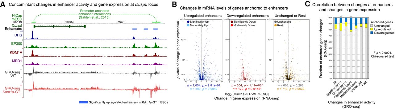 Aberrant changes in enhancer activity are associated with misregulation of physically interacting genes. (A) An example of long-range promoter-enhancer interactions (top track) obtained from the mESCs HiCap data set (Sahlén et al. 2015) at the Dusp5 locus. One of the three significantly up-regulated enhancers (blue bars) interacts with the Dusp5 promoter. Upon the loss of KDM1A, the gene and enhancers show up-regulation of H3K4me2, H3K27ac, and GRO-seq signals in Kdm1a-GT mESCs (red) compared with WT mESCs (gray). (B) Volcano plots of changes in mRNA levels (RNA-seq) of genes that physically interact with misregulated enhancers. On the basis of changes in enhancer-associated GRO-seq signals upon the loss of KDM1A, enhancers were subdivided as significantly up (q < 0.05, DESeq), significantly down, moderately up (0.05 ≤ q < 0.25), moderately down, unchanged (q ≥ 0.5 and fold-change ≤ 25%), and the rest. When multiple enhancers showed interactions with a single promoter, the assignment of the gene to an enhancer subgroup was prioritized in the aforementioned order. The total number of associated genes (n) and P-values (p) from Wilcoxon signed-rank tests on differences between mRNA levels in Kdm1a-GT and WT mESCs are shown beneath each panel. (C) χ2 test of the association of misregulated enhancers (GRO-seq) with the number of misregulated genes (RNA-seq). Significantly up- or down-regulated enhancers were more likely to be anchored to promoters of the genes that showed analogous up- or down-regulation in Kdm1a-GT mESCs. (*) P < 0.0001.