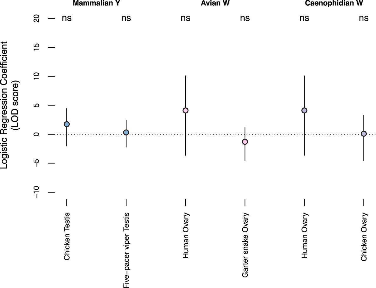 Survivors are not ancestrally specialized for expression in reproductive tract tissues. Coefficients for testis- and ovary-specific expression (circles) and 95% confidence intervals (bars) from logistic regression models of gene survival on sex-specific chromosomes in mammals (blue), birds (pink), and snakes (purple), conditional on breadth of expression. (ns) P > 0.05. After controlling for expression breadth, the regression coefficient is not significantly different from 0 for any tissue from any species.
