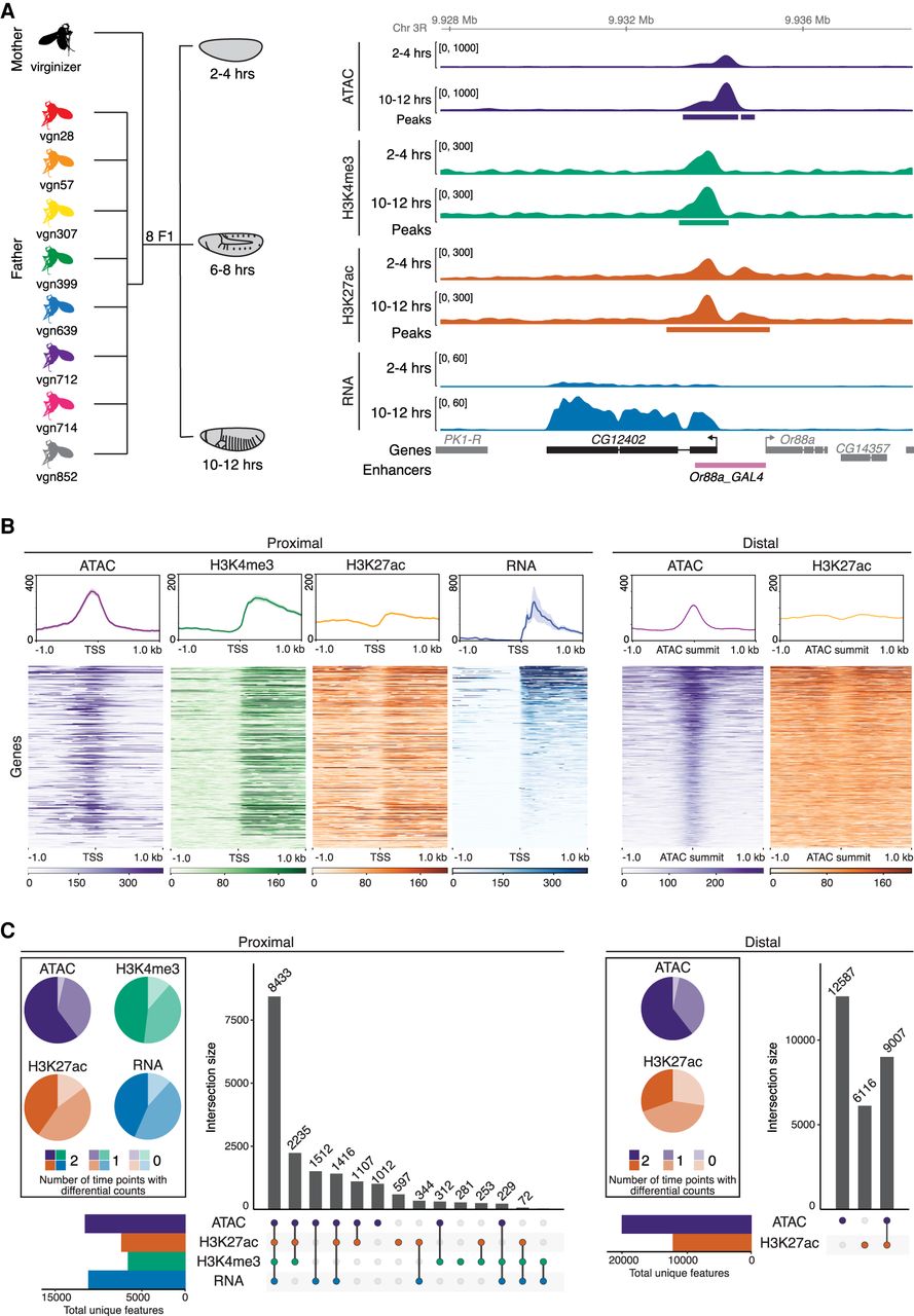 Quantifying gene expression and regulatory element activity in F1 embryos. (A, left) Experimental design and data structure. RNA-seq, ATAC-seq, and iChIP of H3K4me3 and H3K27ac were performed on embryos at three developmental stages from eight F1 hybrids with a common maternal line. (Right) Genome browser overview for the CG12402 locus showing all data for 2–4 h and 10–12 h for the genotype vgn28. Bottom track shows curated enhancers (Kvon et al. 2014). (B, top) Density plots for representative cross (vgn × DGRP-639) at 6–8 h showing read count signal for TSS proximal and distal regions. Plots centered at TSS for promoter-proximal (left) and ATAC summits for distal (right) regions; shaded regions indicate 95% confidence intervals. (Bottom) Heatmaps showing quantitative signal of the same data as above, where rows were sorted by mean RNA-seq (proximal) or ATAC-seq (distal) signal. (C) Upset plots show colocalization of signal for proximal and distal regions for all four data types over all genotypes and stages. Regions common between data types (filled circle) are joined by a vertical bar. Horizontal bar plots indicate the number of unique genes/features. Pie charts indicate proportion of features with statistically different total read counts between time points (color indicates the number of times [0/1/2] the feature is differentially expressed).