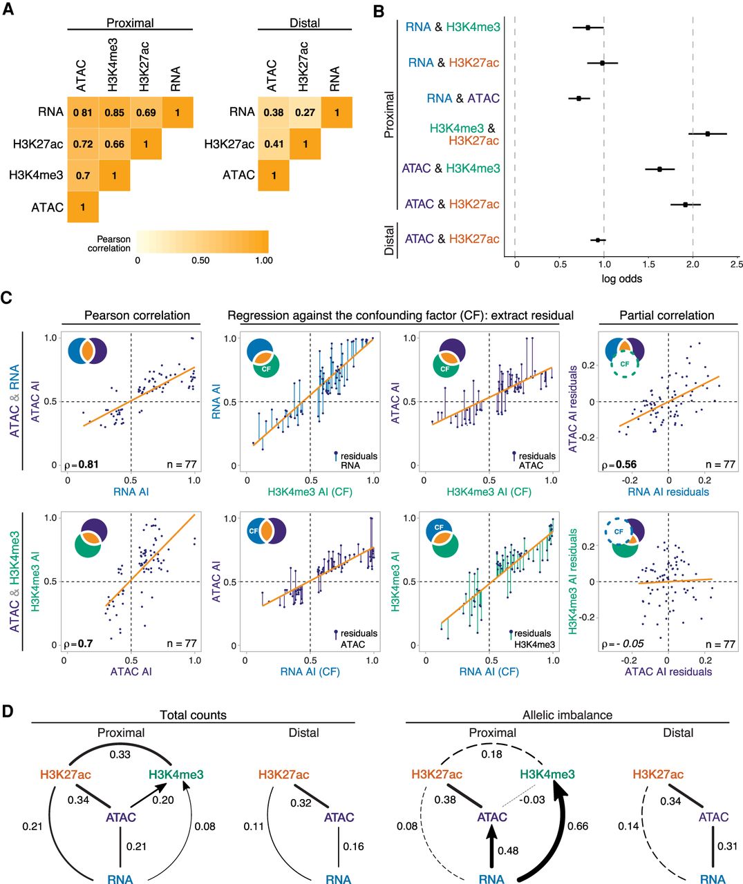 AI is propagated through regulatory layers via different epigenetic paths. (A) Heatmaps show Pearson correlation coefficient of allelic ratios between each data type for promoter-proximal (left) and promoter-distal (right) regions. Data restricted to 6–8 h and 10–12 h and features/genes whose allelic ratio exceeds 0.5 ± 0.06. (B) Log odds (intersection-union test) of co-occurrence of AI between two regulatory layers: 6- to 8-h and 10- to 12-h data shown; bars (from dots), 95% confidence intervals. (C) Stepwise example of partial correlation analysis of allelic ratios between chromatin accessibility and gene expression (ATAC&RNA; top), and promoter-proximal chromatin accessibility and H3K4me3 (ATAC&H3K4me3; bottom). Venn diagram schematics (top left) illustrate the variance of each variable and its shared proportion (orange), measured by linear regression (orange lines). (Left panels) Pearson's correlations for the two comparisons are significant. (Middle) Regression of each initial variable against a third, confounding variable (H3K4me3, upper row; RNA, lower row). Residuals of the initial variables (colored lines) represent the nonoverlapping part of the circle of the same color in the schematic. (Right) Correlations of the residuals, excluding shared variance by the confounding factor (dashed circle in schematic). This resulting partial correlation is significant in the top, and not in the bottom, examples. (D) Partial correlation and directional dependency regression for total counts (left) and allelic ratios (right). Significant partial correlations (solid lines) suggest direct dependencies among regulatory layers. For each significant edge (P < 0.01), copula regression was used to assign directionality (arrows; delta > 0.01). Line thickness indicates the value of partial correlations; dashed lines indicate nonsignificance. Promoter-proximal and promoter-distal results shown separately.