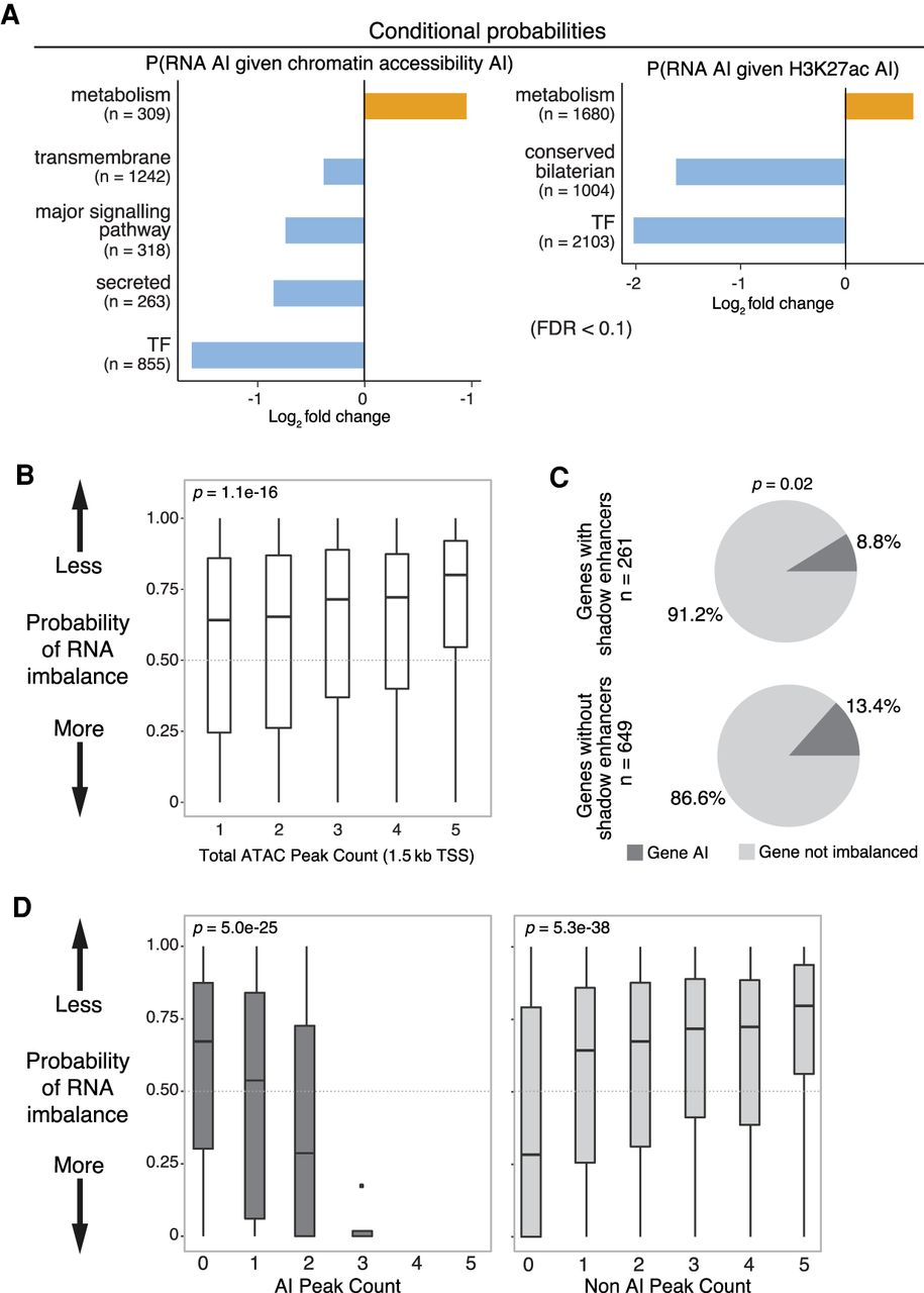 Regulatory buffering varies across gene categories and with local chromatin structure. (A) Conditional probability of AI in gene expression given AI in associated chromatin (left) and H3K27ac (right) peaks across gene categories. X-axis shows log2 fold change; background is genome-wide expectation. Gene categories enriched (orange) or depleted (blue) for imbalance are indicated (FDR > 0.1, Fisher's exact test). n = number of genes per category combined across all lines and both 6- to 8-h and 10- to 12-h samples. (B) Box plots show probabilities of AI in gene expression based on numbers of neighboring ATAC peaks (TSS < 1.5 kb). Genes with more ATAC peaks are less likely to show AI. (C) Pie charts show the proportion of genes with AI in RNA associated to ATAC-seq peaks overlapping known partially redundant/shadow enhancers (top) or not (bottom). Genes associated with shadow enhancers are less likely to have AI (determined using a beta-binomial model; x2=5.3, P = 0.02). (D) Box plots show the probability of AI in gene expression (P-value from a beta-binomial model; y-axis) as a function of the number of ATAC-seq peaks with AI (left) or not imbalanced (right).