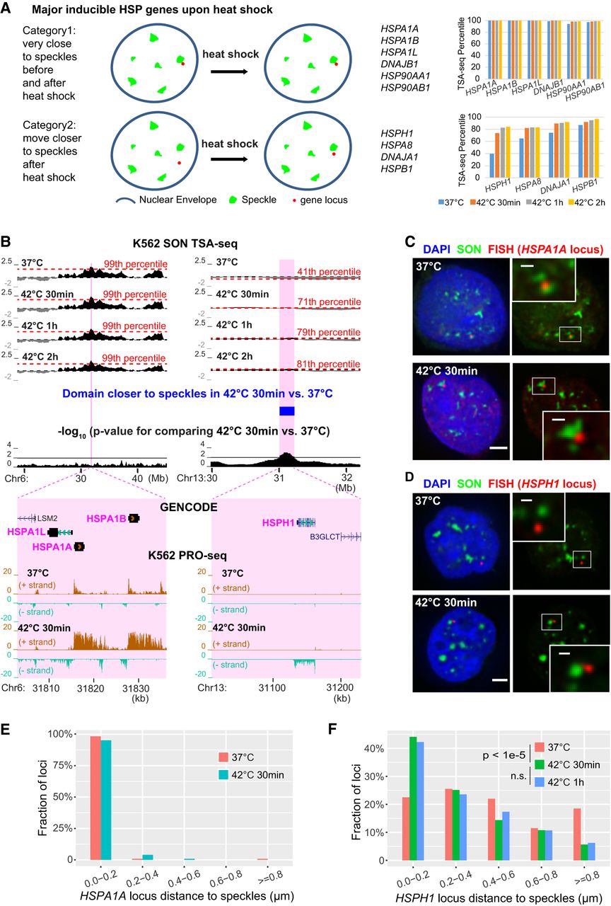 Approximately half of inducible heat shock protein (HSP) gene loci are prepositioned very close to nuclear speckles in SPADs while remaining gene loci shift closer to speckles after heat shock. (A) Schema (left) and TSA-seq percentiles at 0 (blue), 30 min (orange), 1 h (gray), and 2 h (gold) after heat shock (right) for genes prepositioned near speckles (top) versus those moving closer after heat shock (bottom). (B) TSA-seq and PRO-seq profiles of HSPA1A (left) and HSPH1 (right) loci in K562 cells after heat shock. Top to bottom: smoothed SON TSA-seq enrichment scores for control or heat shock times (red dashed lines: labeled TSA-seq score percentiles; black dashed lines: zero value), significantly changed domains comparing 37°C versus 42°C 30 min (blue rectangular bar, right), −log10 P-values for comparison of rescaled SON TSA-seq scores between 37°C and 30 min heat shock (20-kb bins), and zoomed view of the highlighted two regions (magenta) plus gene annotation (GENCODE) and K562 PRO-seq tracks showing normalized read count (BPM, 50-bp bins). (C,D) 3D immuno-FISH for HSPA1A (red, C) or HSPH1 (red, D) plus SON immunostaining (green) and merged channels with DAPI (blue, left; scale bars: 2 μm) in K562 cells at 37°C (top) or at 42°C for 30 min (bottom). Insets: 3× enlargement of the white-boxed image area (right, scale bars: 0.5 μm). (E,F) Nuclear speckle distance distributions for HSPA1A (E) or HSPH1 (F) FISH signals in control versus after heat shock. HSPA1A: n = 119 (37°C) or 124 (42°C 30 mins). HSPH1: n = 200 (37°C) or 195 (42°C 30 min) or 225 (42°C 1 h), combination of two biological replicates; χ2 test of homogeneity, P = 3.793 × 10−6 between 37°C and 42°C 30 min, P = 0.9341 (n.s.) between 42°C 30 min and 42°C 1 h.