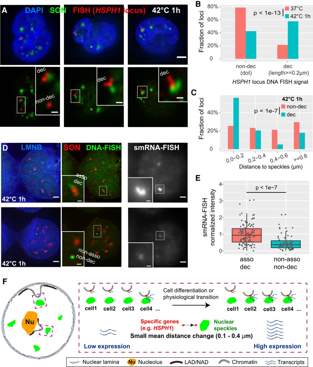 Both distance shift toward speckles and large-scale chromatin decondensation of HSPH1 locus after heat shock correlate with gene expression amplification in K562 cells. (A) 3D immuno-FISH for HSPH1 locus (red) plus SON immunostaining (green) and merged channels with DAPI (blue, top; scale bar: 2 μm) in K562 cells after heat shock (42°C 1 h). Types of FISH signals: left: decondensed (upper, elongated) and non-decondensed signals (lower, dot); middle and right: decondensed signals. Insets: 3× enlargement of region in white box (bottom, scale bars: 0.5 μm). (B) Increase in decondensed HSPH1 loci fraction after heat shock: n = 198 (37°C) or 224 (42°C 1 h), combination of two biological replicates; χ2 test of homogeneity, P = 3.045 × 10−14. (C) Speckle distance distributions for different cases of HSPH1 locus FISH signals in K562 cells after 1 h heat shock (42°C): n = 141 (non-decondensed, dot) or 200 (decondensed, ≥0.2 μm in length), combination of two biological replicates; χ2 test of homogeneity, P = 2.74 × 10−8 between non-decondensed and decondensed. (D) Combined DNA- and single-molecule RNA (smRNA)-immuno-FISH for HSPH1 locus showing DNA-FISH signal (green), SON immunostaining (red), Lamin B1/B2 (LMNB) immunostaining signal (blue), and smRNA-FISH (gray) in K562 cells after 1 h heat shock (scale bars: 2 μm). Decondensed chromatin structure (elongated DNA-FISH signal) with speckle association (top) and non-decondensed (dot DNA-FISH signal) not associated with speckles (bottom) and their corresponding smRNA-FISH signal (right). Insets: 3× enlargement of white-boxed area (scale bar: 0.5 μm). Single optical section is shown containing center (in z) of DNA FISH signal; RNA-FISH images correspond to projected sum of 20 optical sections. (E) Normalized smRNA-FISH signals corresponding to different chromatin states based on DNA immuno-FISH. Combination of two biological replicates: asso dec: distance to speckles <0.4 µm and signal length ≥0.4 µm, n = 108, mean = 1.00, median = 0.93; non-asso non-dec: distance ≥0.6 µm and dot signal, n = 68, mean = 0.50, median = 0.37. Box plots (data points: gray dots, means: red dots) show median (inside line), 25th (box bottom) and 75th (box top) percentiles, 75th percentile to highest value within 1.5-fold of box height (top whisker), 25th percentile to lowest value within 1.5-fold of box height (bottom whisker). Welch's t-test: P = 1.179 × 10−8. (F) Cartoon model: small mean distance changes relative to nuclear speckles predicted by TSA-seq may reflect changes in the distribution of distances such that an increased fraction of alleles shows close association with nuclear speckles with an accompanying amplification of gene expression.