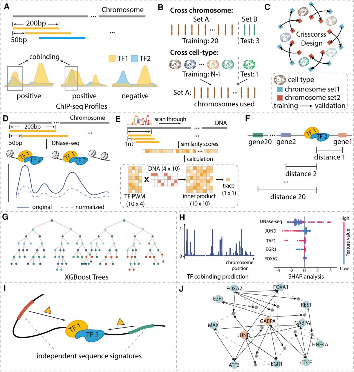 Machine learning–based method for identifying independent sequence signatures for TF binding and cobinding. (A) Preparing gold standard co-occupancy profiles from the ChIP-seq data of single TF binding profiles. For each 200-bp genomic interval of interest, it was labeled as ‘cobound’ if the labels of both TFs at this interval were ‘bound.’ (B) Train-test data partition for cross-chromosome and cross-cell type cases. (C) Crisscross design of model training and validating. Chromosomes were split into two sets. The blue and red squares represent the chromosome set 1 and set 2, respectively. The starting point of the arrow represents the training data set, and the endpoint of the arrow represents the validation data set. (D) DNase-seq-based features. Quantile normalization was applied to the original reads to eliminate experimental biases. In the plot, the dashed line is the values after quantile normalization and the solid line is the original reads. (E) DNA sequence and motif-based features. (F) Distance-to-gene features. Top 20 closest distances to proximal genes are calculated according to GENCODE annotation. (G) Illustration of tree-based machine learning models. (H) Predictions are continuous values between 0 and 1, which were generated by averaging results from all built models, and SHAP analysis (figure is illustrative only) was used to calculate feature importance in predicting TF cobinding. (I) Independent sequence signatures affect TF cobinding. (J) Illustration of TF cobinding effector network. Dashed lines connect TF pairs, and solid arrows connect TF-specific effectors with TF- or TF pair–specific effectors with TF pairs.