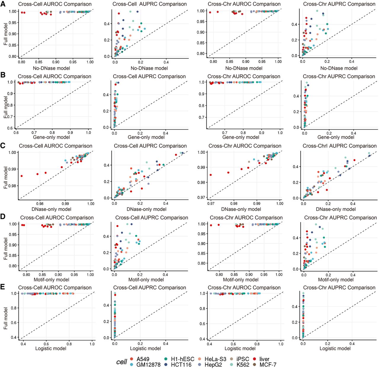Performance of models with different features. (A) Comparison of performance between model without DNase-based feature and model with full features. (B) Comparison of performance between model with gene distance–based feature and model with full features. (C) Comparison of performance between model with DNase-based feature and model with full features. (D) Comparison of performance between model with sequence motif–based feature and model with full features. (E) Comparison of performance between logistic regression model with full features and XGBoost model with full features.