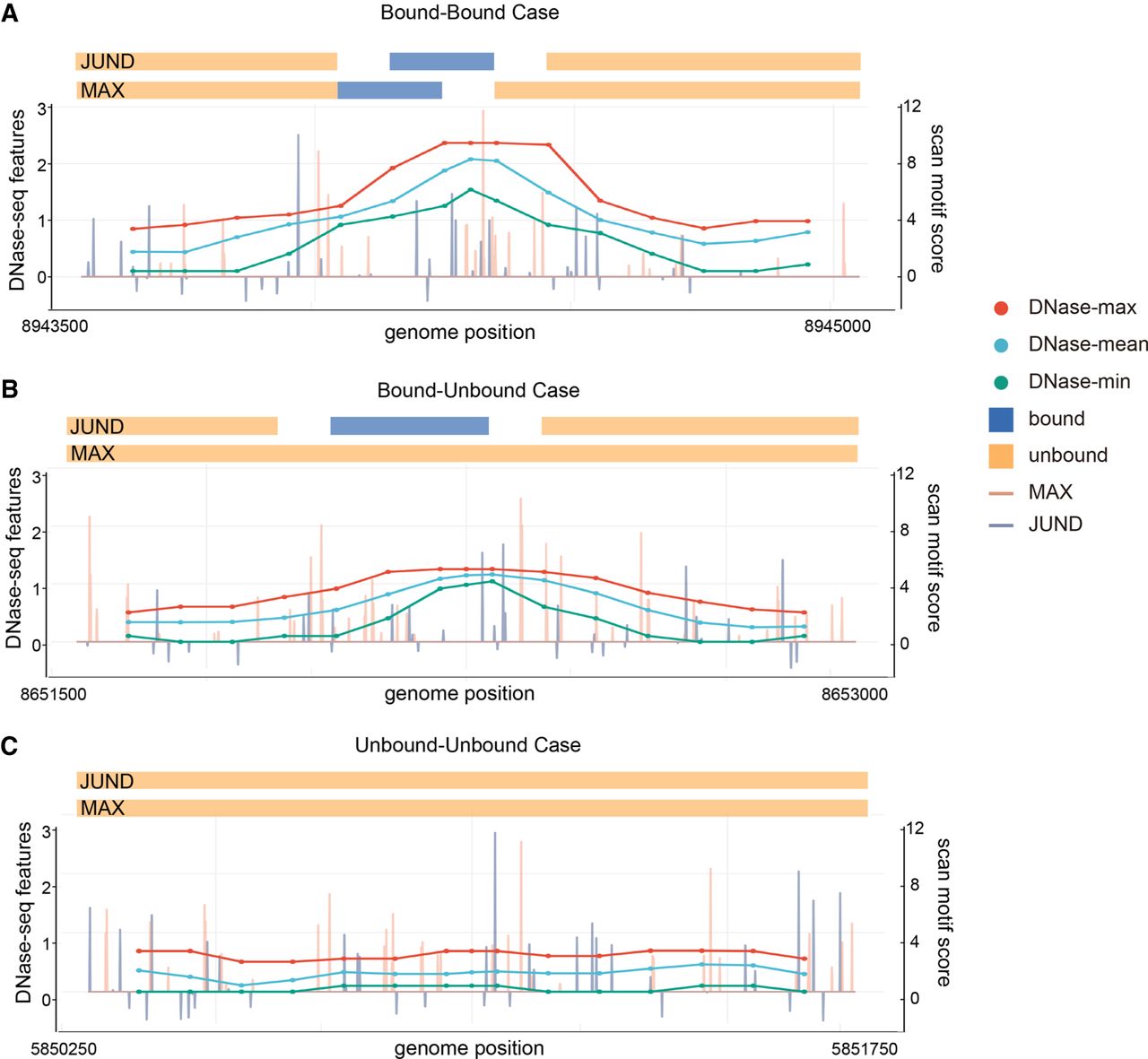 Examples of predicting TF-TF cobinding and un-cobinding events. The comparison of TF binding signals from ChIP-seq (the blue/orange horizontal bar on the top), DNase-seq-based features (the red/blue/green scatter points and lines in the middle), and TF motif hits (the blue/orange vertical bars on the bottom). (A) A cobound (Bound-Bound) case of the JUND-MAX pair in Chromosome 2 between position 8944200 and 8944400 in K562. The red, blue, and green dots represent the maximum, mean, and minimum DNase-seq values, respectively, in a 200-bp interval. The two bars on the top highlight the binding locations MAX and JUND. Our prediction for this interval is ‘cobound’ (0.9938). (B) An un-cobound (Bound-Unbound) case in Chromosome 2 between position 8652400 and 8652600. Specifically, JUND is bound while MAX is unbound in this interval. The prediction for this interval is ‘un-cobound’ (0.8174). (C) An un-cobound (Unbound-Unbound) case in Chromosome 2 between 5850900 and 5851100. Both JUND and MAX are unbound. The prediction for this interval is ‘un-cobound’ (0.1851).