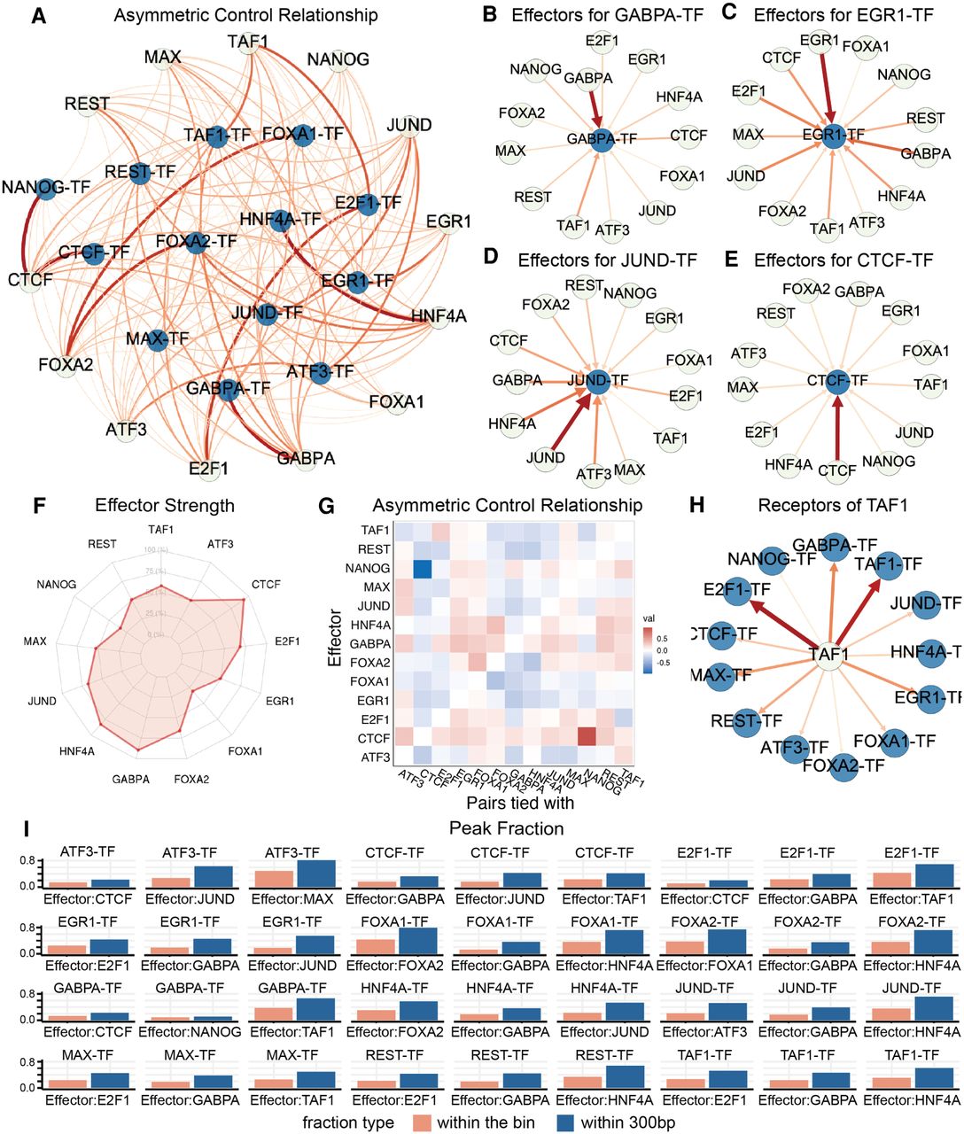 Asymmetric regulatory relationships of TF-TF pairs in controlling cobinding. (A) In this network, each node represents a TF or a TF-TF pair. Each edge that connects a TF and a pair represents the contribution of that TF to the pair when predicting cobinding events. The width and color of an edge represent the strength of the contribution. (B–E) Directed regulatory networks of TF-TF pairs effectors. In each network, the blue node represents a TF-TF pair and the light color node represents a TF motif signature. The arrow direction represents the contribution of a TF to a TF-TF pair. The width and color of an edge represent the strength of the contribution. In B, GABPA, TAF1, and CTCF are the three most effective effectors for pairs tied with GABPA. In C, JUND, TAF1, and EGR1 are the most effective effectors for pairs tied with EGR1. In D, JUND is the most dominant effector for pairs tied with JUND. In E, CTCF is the most dominant effector for pairs tied with CTCF. The four examples show that the contribution of different TF effectors and both pair-relative and pair-irrelative TFs affect cobinding. (F) Radar plot of effectors strength averaging over pairs. Among the 13 TFs, CTCF, JUND, and TAF1 are the three most contributive effectors compared with other TFs. (G) Asymmetric control heat map. Each cell represents the difference between (1) the contribution of TF1 to pairs tied with TF2 and (2) the contribution of TF2 to pairs tied with TF1. Positive and negative values are shown in red and blue, respectively. (H) Contribution of TAF1 is different when predicting the cobinding of pairs tied with different TFs. (I) Peak fractions of TF-specific effectors binding with TF pairs. Red bars: the fraction of the effector binding in the bins under investigation; blue bars: the fraction of the effector binding within 300 bp of the bins under investigation.
