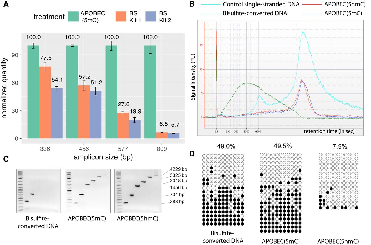 Enzymatic deamination preserves the integrity of the DNA. (A) qPCR results show the quantities of undamaged amplifiable DNA templates of different sizes after the enzymatic deamination (green) and bisulfite treatments (orange and blue). All quantifications are normalized to the values obtained for the enzymatic deamination experiments. (B) Agilent 2100 Bioanalyzer trace on RNA 6000 pico chip comparing equal amounts of mouse E14 genomic DNA sheared to an average of 15 kb and treated with sodium bisulfite (green), APOBEC(5hmC) (red), or APOBEC(5mC) (blue) over the control ssDNA (cyan). Bisulfite treatment fragmented the DNA to an average of 800 bp, whereas enzymatically treated DNA shows no notable size differences compared with control DNA. (C) Agarose gel images of end-point PCR of six amplicons ranging from 388–4229 bp illustrating upper amplicon size limit for sodium-bisulfite-, APOBEC(5mC)-, or APOBEC(5hmC)-treated E14 genomic DNA. (D) The 731-bp amplicons from the E14 genomic DNA shown in C were cloned and sequenced, and the methylation status was determined by bisulfite treatment (left), the enzymatic deamination method for 5mC (center), and the enzymatic deamination method for 5hmC (right) (Supplemental Data S1). Open and closed circles indicate unmethylated and methylated CpG sites, respectively.