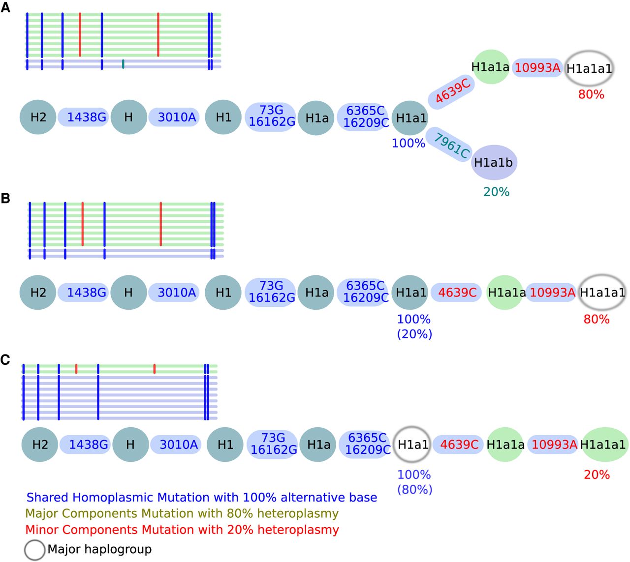 All possible contamination scenarios. Here, a contamination level of 20% is shown in all three scenarios (A–C). Shared polymorphisms of two haplotypes are included in a single branch, whereas the split into two branches displays the different lineage haplotypes. (A) Shared mutations defining H1a1 (last common ancestor [LCA]) are present at 100%, whereas 7961C is present only at 20%, defining the minor haplogroup H1a1b, whereas 4639C and 10993A are present at 80%, defining the major haplogroup H1a1a1. (B) A mixture of two haplotypes within a single lineage but of different lineage depths (minor haplotype H1a1 and major haplotype H1a1a1) is observed if no minor haplotype can be found. (C) A mixture of two haplotypes within a single lineage but of different lineage depths (minor H1a1a1 and major H1a1) is detected if the minor haplotype results in a stable haplogroup. Shared homoplasmic sites facilitate the identification of the branching pattern in all three scenarios and improve the overall haplogroup quality. The used notation for variants (e.g., 1438G) includes the mtDNA position (1438) followed by the actual base change (G).