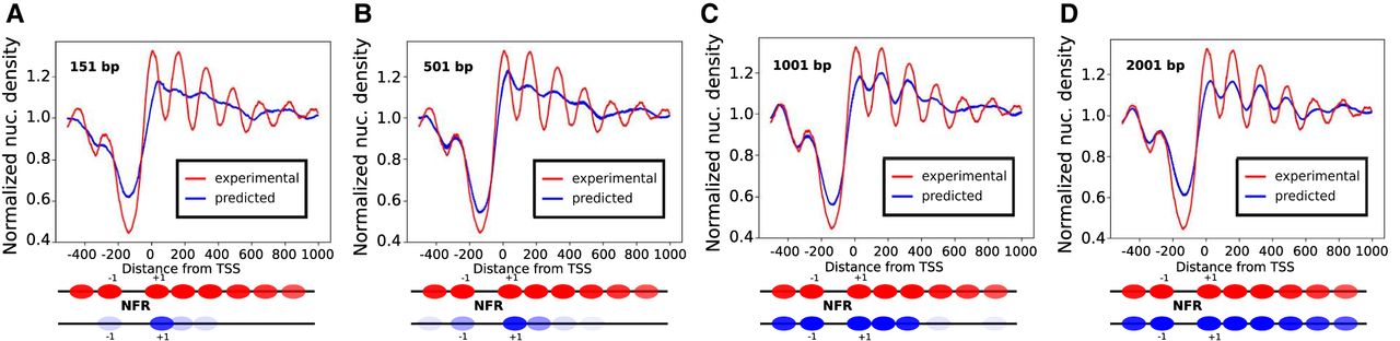 Influence of the input length L on the pattern of the predicted nucleosome density in TSS regions. Average predicted (blue) and experimental (red) nucleosome density in TSS regions. The predicted nucleosome density is here obtained with CNN models trained with different values of L ([A]: 151 bp, [B]: 501 bp, [C]: 1001 bp, [D]: 2001 bp). The other hyperparameters of the network are the same. Nucleosome positions (in red for the experimental and blue for the predicted densities) are sketched below the curves. +1 and −1 refer to the first nucleosomes before and after the NDR.